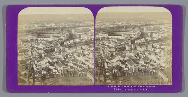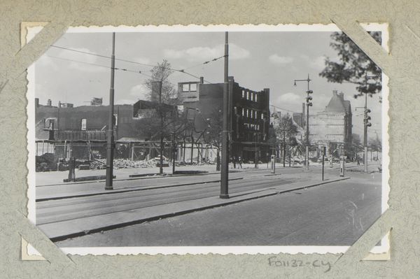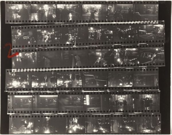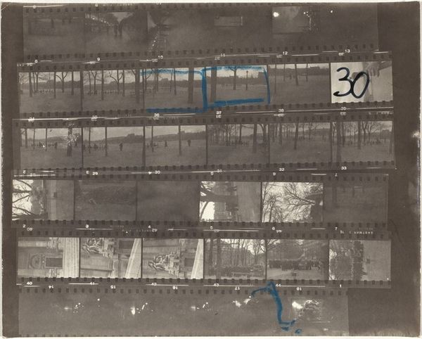Editor: Here we have Hamblin Studio's "Untitled (aerial view of downtown)," of unknown date, residing at the Harvard Art Museums. It's a photographic negative, which gives it this eerie, ghostly feel. What strikes you most about its composition? Curator: The inverted tonality invites a structural reading. Note the strong horizontal lines of the buildings contrasting with the stark verticality of the bare trees. This interplay creates a dynamic tension. Observe also how light and shadow are reversed, disrupting our usual visual cues. Editor: So, the reversal of light and shadow isn't just a byproduct of the medium, but a deliberate aesthetic choice? Curator: Precisely. The artist exploits the negative space to redefine depth and form. This subversion of expected visual patterns forces the viewer to actively decode the image, engaging in a deeper perceptual analysis. Editor: I see what you mean, it really makes you look at it differently. Curator: Indeed, the negative becomes a powerful tool, transforming a familiar scene into an intriguing abstraction.
