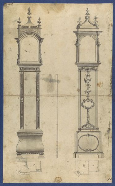 Here are the designs for bed pillars, made with pen and grey ink on laid paper by Thomas Chippendale. Immediately striking is the symmetry in the distribution of vertical forms, each pillar a study in the articulation of classical elements through linear precision. Consider the structural logic at play: each pillar presents a tripartite division, from base to capital, echoing the architectural orders of antiquity. Chippendale’s strategic use of line is not merely descriptive but analytical. Note the small diagrammatic details alongside each pillar. These aren't embellishments, but rather, they serve as a semiotic key, unlocking the ornamental grammar encoded within each design. These pillars offer a fascinating study in form and function. They speak to a broader cultural discourse of luxury and refinement, where even the most private of spaces was conceived as a stage for displaying one's discerning taste.