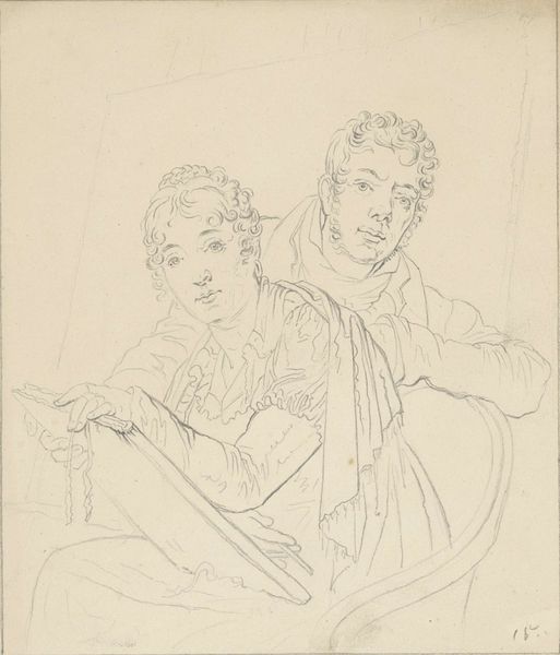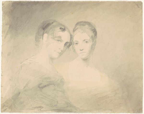 Curator: At the Städel Museum, we're looking at a drawing entitled "Doppelbildnis zweier junger Frauen," or "Double Portrait of Two Young Women," by Carl Barth. Editor: My initial feeling is one of delicate intimacy. The pale ground emphasizes the softness of the lines, giving the figures a near-ethereal quality. It feels very much like an unfinished memory. Curator: The pairing immediately brings to mind themes of kinship and mirroring. It seems as if their relationship is a vital component to understanding their individual identities. The hand clasp feels less romantic, and more about familiar support. Editor: Agreed. I’m also struck by the use of line. Look how lightly Barth describes the forms—it's almost tentative. The hatching creates a sense of volume without fully committing to a definitive contour. Semiotically, the drawing seems to represent a kind of possibility, something still in process. Curator: This resonates with their apparent youth. And the fashionable dresses and hairstyles place them within a specific historical context—though the lack of distinct color renders them timeless in some ways. It really could be anytime in the early 19th century, as that's roughly when Barth was active. Editor: Yet, it's the negative space that holds the eye; notice the air between them is charged. Their expressions suggest an exchange; is it sisterly affection or are they each seeking approval? It's quite clever how Barth manipulates value and implied lines to amplify their inter-relation. Curator: Right, because faces were such important symbols of identity during this period, pairing them prompts us to consider not just individual identity but also socially constructed images of women during this timeframe. Are we seeing them how society dictates they should be seen, or something else? Editor: The inherent ambiguity invites diverse readings of their characters. Their gaze transcends simply capturing physical resemblances—it also invites philosophical questions about existence and the construction of "femininity". Well, this has given me a great deal to contemplate further! Curator: For me, it serves as a reminder that images from the past contain living meanings about who we are today, through the stories we create for ourselves when viewing.