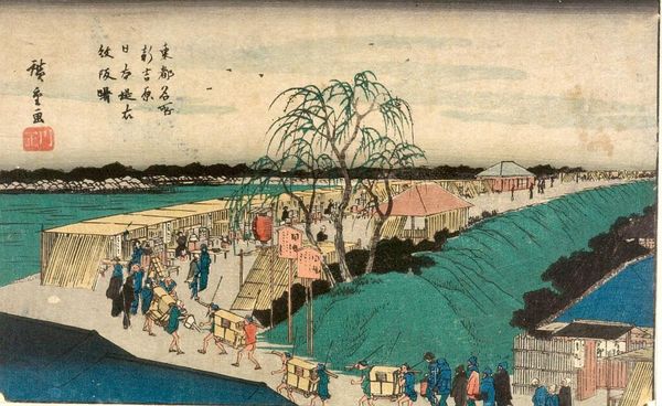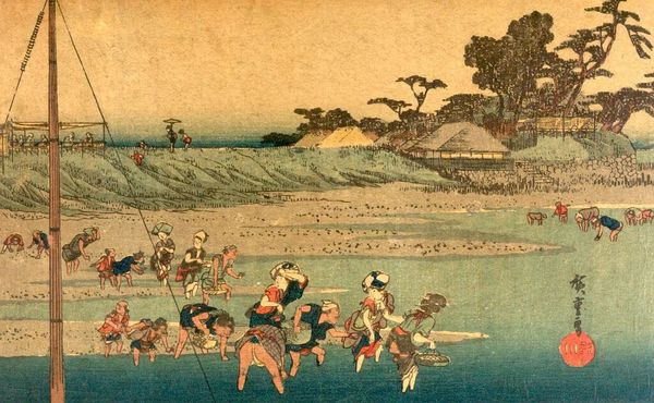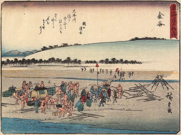 Curator: This print, titled "Tokaido Goju-San-Tsugi", is from Utagawa Hiroshige's series depicting scenes along the Tokaido Road. Editor: The first thing I notice is the stark contrast of the cool blues and greens against the sandy foreground, giving it a slightly melancholic feel. Curator: Hiroshige's series was immensely popular because it depicted the everyday life of travelers and the working class, reflecting social mobility. Editor: And you can really feel the labor here. The laborers working so hard, the lines stretching across the shore suggesting continuous movement and perhaps even oppression. Curator: The series made landscape art accessible, connecting with a broader audience by portraying familiar scenes of commerce and transit. Editor: It is a powerful snapshot of the relentless drive of society. It makes you consider who is driving and at what cost.
