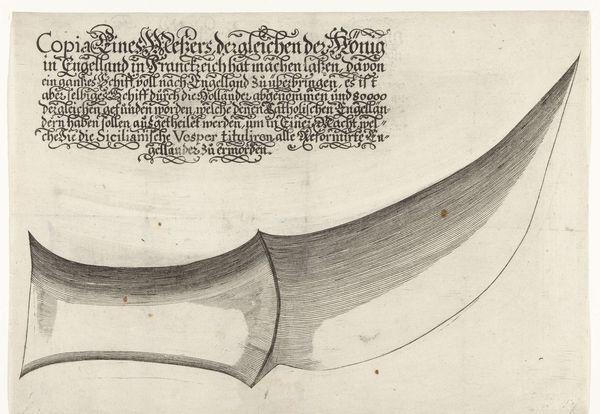 Curator: The stark simplicity of this engraving hits you right away, doesn't it? Editor: It does. Stark is the word. This single knife against the aged paper... It feels menacing, almost unsettling in its quiet way. Curator: Well, that feeling is by design. This is an engraving dating from 1688-1689, and the Rijksmuseum calls it "Knives Found on a French Ship Intended to Murder Protestants in England, 1688". It's attributed to an anonymous artist. Editor: So, this isn’t just a knife, it's a symbol loaded with political and religious terror. Knowing its historical context, one immediately recalls the anxieties and sectarian violence of the period. A single object carrying immense cultural weight. Curator: Precisely. The text accompanying the image details the purported discovery of ten thousand knives on a French ship. Look at the style: the clean lines of the baroque style amplifying that air of authority while simultaneously sparking a visceral fear through suggestion. The visual vocabulary here relies heavily on that cultural memory of religious conflict. Editor: I see what you mean. The image itself is devoid of drama, and in isolation it just seems like a knife. It only acquires its horrifying significance within a specific historical and cultural narrative. It speaks volumes about how fear was manufactured and disseminated through printed images. It’s propaganda, essentially. Curator: Exactly. Notice how even the type feels "hand-drawn." This gives the image a folksy, immediate character—as if to reinforce this event's alleged authenticity and the very real danger. The line work gives the impression that no expense has been spared and therefore, by extension, that its authenticity cannot be doubted. It wants you to instantly think that you yourself might be its victim. Editor: Considering the function of prints as a means of mass communication at that time, I begin to question the function of such images in fomenting public anxiety and paranoia. Were the fears it stoked genuine, or politically motivated? Was this 'knife' just as much a weapon for war in visual form? Curator: Good point! Images like these became tools to stoke the fires of religious animosity, galvanizing public opinion against perceived threats. This was no mere recording; it was incitement, plain and simple. Editor: A chilling reminder of the power of imagery in shaping social realities, even through something as simple as a knife. Curator: And a potent reminder that even seemingly straightforward depictions can carry tremendous symbolic and historical weight.