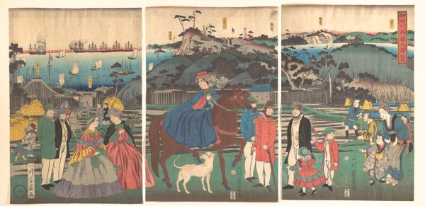 Curator: I'm struck by the graphic quality of this print—the bold lines, the defined shapes of people and buildings. Editor: I agree. Let’s dive into this fascinating triptych titled "Foreign Business Establishment in Yokohama," created in 1861 by Utagawa Sadahide. The artwork is currently housed at the Metropolitan Museum of Art in New York. Curator: Immediately, one notes the rigid architectural setting punctuated by those figures in vivid garments. It's as if the artist intended to foreground an almost unsettling cultural friction through form and color contrast. Editor: Absolutely. Look closer—this ukiyo-e print uses woodblock printing techniques to showcase the burgeoning foreign presence in Yokohama. This wasn't merely an artistic rendering; it was documenting, and arguably shaping, public perception of this transformative period. Consider the labor involved—the carvers, the printers, the paper makers—all contributing to the dissemination of this image. The materials used, the specific dyes available at the time, they all influence how we read this image today. Curator: Good point, although I also find the symbolic relationships at play really compelling. The Western figures and their modes of dress create distinct shapes—triangles and vertical blocks—which create a feeling of imposition on the softer curves of the Japanese figures and architecture. What do you think that division conveys? Editor: I think it reveals a certain social hierarchy inherent in the interactions of these figures. There is the presence of these foreigners changing the shape and, therefore, economy of Yokohama itself. You have Japanese people serving them, selling to them, adopting aspects of foreign clothing. Their labor has adapted, it appears, and this artwork stands as evidence. Curator: It is hard to ignore the tension created between an older order giving way and the new presence of foreign influence reshaping both physical and cultural landscapes. But whether this shift signifies cultural enrichment or erosion is left for the viewer to decode in this striking arrangement of shapes, forms, and textures. Editor: Ultimately, what began as a glimpse into the past offers critical insight into power structures that still reverberate. I’ll consider this print as I walk through the international stores in my own neighborhood next time.