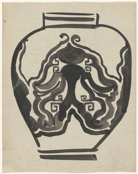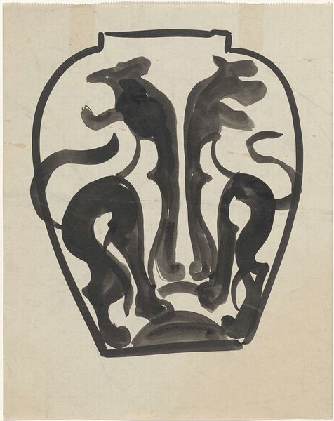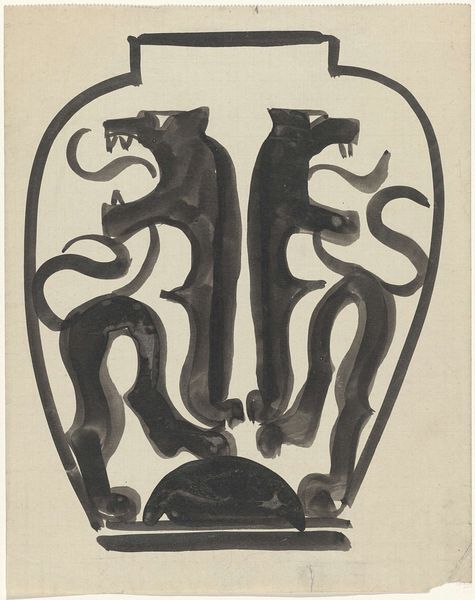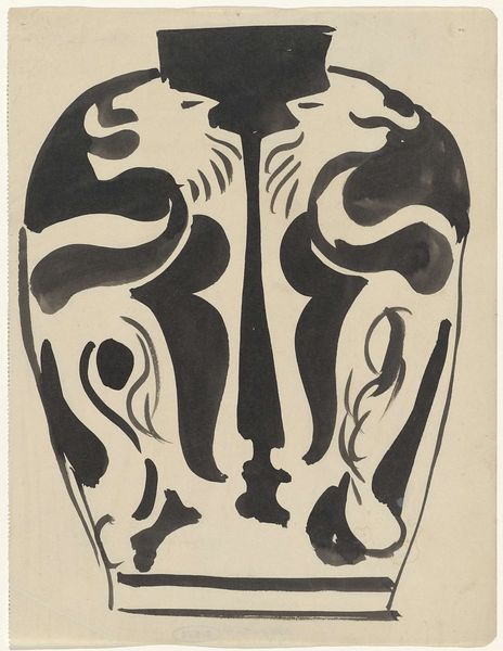 Carel Adolph Lion Cachet made this vase design with pen and brush in ink. The spontaneous brushstrokes feel like you're watching an idea take shape, each stroke a decision, a little dance. Look at the way the ink pools and thins, creating depth with just one color. The creatures on either side of the vase, are they dragons? Lions? They’re mirrored, but not perfectly, giving them a lively, almost conversational feel. The overall texture is smooth but lively. You can almost feel the drag of the brush across the paper. That bold, almost clumsy stroke outlining the vase’s form, it doesn’t try to hide its imperfections. It's kind of punk, in a way. It reminds me of some of Philip Guston's more cartoonish line work. It's like Cachet is saying, "Here it is, process and all." And maybe that’s the point – art isn't about perfection, but about the messy, beautiful act of making.