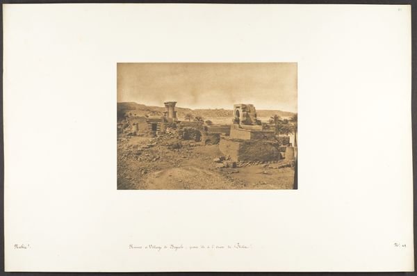 Curator: Standing before us is Maxime Du Camp's "Ruines du Temple d'Herment (Hermentis)", a gelatin-silver print from around 1849 to 1850. Editor: My immediate impression is one of melancholic grandeur. It feels desolate, yet the scale hinted at by the remaining columns is awe-inspiring. Curator: Absolutely. Du Camp, working alongside Gustave Flaubert, captured these ruins in Egypt, not just as a record, but as a commentary on time and empire. It raises so many questions about what it means to make images of ruined spaces, as both cultural heritage sites, and spaces of lived historical memory. Editor: Precisely. The desaturated tones and almost symmetrical composition evoke a sense of loss and abandonment. These spaces are heavy with layers of meaning about race, gender, and class as power constructs. They stand here silent witness to power, but they also become newly invigorated as a space of potential reinterpretation, no? Curator: Exactly. One almost senses a ghostliness here, perhaps reflecting on all the peoples displaced across centuries. It is fascinating that this image, rendered through what was then a novel medium, speaks of civilizations long past, a technology attempting to arrest something in history, to both capture and re-imagine, or re-contextualize, what once was. Editor: Right, and it's not just a neutral record. The very act of selecting this vantage point, framing the decay, contributes to a specific narrative. The image is implicated within broader movements and moments that focus on how these structures came to fall in disrepair. To whose hands were the bricks given? Why did things collapse and what can they tell us about the contemporary ruin of things, institutions, people? The way the photographer captures the textures is amazing! Curator: Absolutely, and Du Camp does it in a way that’s incredibly resonant, still today. I feel, after all this, drawn again to think through what he means to capture and whether this rendering succeeds. Editor: Indeed. Considering the passage of time since this was taken adds another layer of complexity to understanding how visual language and photography become entangled. These images speak across and through time, offering important, and fraught insights into both then and now.