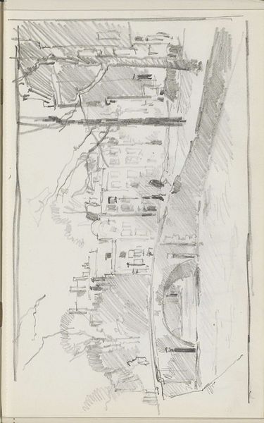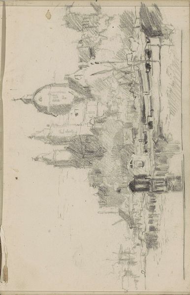 Editor: So, this is "Ronde Lutherse Kerk aan het Singel te Amsterdam," a pencil and pen drawing on paper by Cornelis Vreedenburgh, sometime between 1890 and 1946. It's striking how the dome of the church dominates the cityscape. What's your interpretation? Curator: I see a fascinating document of Amsterdam's evolving urban landscape and the role of religious architecture within it. The Lutheran Church, prominently featured, stood as a symbol of a specific religious community navigating its place in Dutch society. Think about the public function of this building. What statement was the Lutheran community trying to make by positioning such a structure along the Singel? Editor: That's a good point. It does seem deliberately positioned, almost asserting its presence. So, it’s not just about the architecture, but about making a statement. Curator: Exactly. And consider the date: between 1890 and 1946. This period saw significant social and political shifts in the Netherlands. This drawing isn’t merely a depiction of a building; it reflects the social fabric of Amsterdam during that era, and the role of art in portraying those urban transformations. What message do you think this artist tries to capture by depicting an ordinary daily life against such important architectures? Editor: I suppose it grounds the grandeur, showing how everyday life continues, regardless of grand architecture or societal changes. Curator: Precisely. By capturing that contrast, the drawing offers insights into the social dynamics and power structures embedded in the city’s visual environment. What new thoughts do you have after seeing this work? Editor: It makes you consider art's role as not just aesthetic, but also social commentary, reflecting the evolving identity of the city and its inhabitants. Curator: Indeed. It reveals how much history can be layered into what seems like a simple sketch of a building.