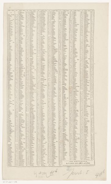 Editor: This is "Plaatsregister van alle dorpen en steden te vinden op de bijbehorende kaart (linkerblad)" by Frederik de Wit, dating from between 1666 and 1710. It's an engraving, essentially a very detailed list. It seems so… utilitarian. How can we consider something like this through the lens of art? Curator: This "utilitarian" list speaks volumes about the society that produced it. Consider the labour involved in its creation: the engraver meticulously carving each letter, the papermaker crafting the material support. It reveals a societal need for organization and control over geographical space. Editor: Control? Curator: Yes. Cartography in the 17th century was deeply intertwined with trade, navigation, and colonial expansion. This isn't just a list of towns; it’s a tool for managing resources, projecting power. Where did De Wit source his materials – the paper, the ink, the metal plate? How accessible was this kind of information to the general populace? Who was meant to use it? These questions highlight the relationship between artistic production and the broader economic and political structures. Editor: So, you're saying its artistic value comes from understanding how it was made, what it was made of, and who it was for, and why? Rather than some aesthetic quality? Curator: Precisely. This piece blurs the lines between art, craft, and commodity. It forces us to examine the conditions of its production and consumption and reconsider where we draw those boundaries in the first place. Editor: That's fascinating, I never would have thought of that by looking at just a list of towns and villages. Curator: Indeed, seeing it this way reveals so much about the means by which society operates. Editor: Well, I’ll definitely be looking at things differently now. Thanks for opening my eyes!