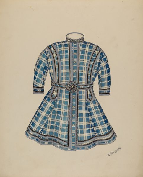 Editor: Here we have "Child's Dress" by Nancy Crimi, dating from around 1935 to 1942. It appears to be a textile or watercolor drawing, maybe for fashion design. I’m immediately struck by how delicate and precise the plaid is, and the little decorative flourishes give it such a sweet, old-fashioned charm. What captures your attention in this piece? Curator: It’s funny you say old-fashioned; to me, it's timeless, wouldn’t you agree? I mean, I see that carefully rendered plaid, that beautiful marriage of blues, greens, reds…it speaks to me of heritage and tradition. It’s like peeking into a world where craftsmanship and detail were treasured. It's decorative art in its own right. Don't you think that the eye isn't immediately drawn to those charming buttons cascading down the dress? It has almost architectural quality! Editor: I agree! I especially like the decorative elements contrasting against the structure of the dress’ lines. The use of trim reminds me of a folk costume in its execution, too. Curator: Exactly! What’s interesting, isn’t it, how something seemingly simple can spark so many connections, almost like a secret language woven into the very fabric of our history. And perhaps this little dress, in its own quiet way, reminds us of a slower time, of the tender care and love poured into every stitch. Editor: I didn’t think about it that way initially, but I think you’re right. I definitely see the history woven in through the details now. Thanks for opening my eyes! Curator: My pleasure!