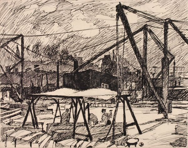 Henry Lyman Saÿen created this untitled drawing using ink on paper. The image presents us with a stark industrial landscape. The factory smokestacks and electrical towers speak to the rapid industrialization of the early 20th century in America. Saÿen, like many artists of his time, grappled with how to represent the changing social and economic structures around him. Was industrial progress a positive step for society, or a destructive force? The loose, almost chaotic lines suggest a sense of unease or even alienation in this new, mechanized world. The two human figures look lost against the industrial setting. To truly understand this piece, we might consider it in relation to the artist's biography, as well as the cultural debates surrounding industrialization at the time. We can ask if it is a celebration of progress, or a critique of its impact on the environment and human experience. Through these approaches, we can begin to unlock its deeper social and historical meanings.