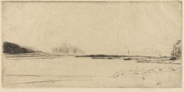Curator: Ah, this print evokes such stillness. Editor: Doesn't it? A quiet sort of epic. We're looking at "Dunstaffnage," an etching by David Young Cameron, created around 1915. Curator: My first thought was—ethereal. That castle, barely a suggestion on the horizon, shrouded in a hazy dream. Editor: Cameron was a master of manipulating light and shadow. Notice how the delicate lines create depth, drawing your eye from the foreground right into the hazy distance. He has structured the whole composition through the subtle manipulation of tonal contrasts. Curator: The sparseness makes me think of half-remembered places, the way a landscape etches itself on your memory—imprecise, atmospheric. A whisper of what was, perhaps? I bet there's symbolism to unlock! Editor: Possibly! There's definitely a romantic impulse here, typical of the Scottish Colorists. Cameron evokes a landscape imbued with historical significance. Curator: He must have stood there, etching plate in hand, and breathed in the Scottish air. The very air seems to permeate the piece, lending it this ghost of presence. Did he go through some crisis during the period it took to compose it? Editor: The First World War casts a long shadow. Perhaps it’s a nostalgic yearning, or maybe just his engagement with architectural forms within natural landscape settings. In all ways it exemplifies his technical facility, Curator: Perhaps both! The heart holds space for multitudes, especially as the mind processes trauma. To contemplate a familiar location during crisis allows people to keep some continuity to their sense of reality. Editor: It's remarkable how Cameron manages to communicate such emotional complexity through such minimal means, a soft yet durable visual encounter to take to memory. Curator: Absolutely, this little print has unfurled into quite the introspective landscape for me! I will return again and again.