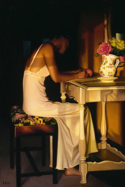 Curator: Let’s discuss “Lilacs,” a 2016 oil painting by Luis Álvarez Roure. Editor: My first impression is that it radiates tranquility. The palette is soft, almost muted, with the figure bathed in a gentle, diffused light. It has an air of serenity that feels very intentional. Curator: The painting’s adherence to realism situates the sitter firmly in our own time, even if her relaxed pose and simple, flowing white dress feel reminiscent of earlier, more romanticized portraits. I think this tension offers interesting social commentary about our relationship to tradition. What meaning can you extract from the symbolism evident? Editor: Definitely! The gaze seems both intimate and removed. What does the figure holding a piece of paper indicate about gender and class expectations? Does she exist for viewers alone? Curator: Perhaps this hints at interiority, thought, maybe even introspection, which speaks to themes of psychological observation in intimate moments of repose, like those from the early twentieth-century Intimist painters. She seems almost meditative, distanced from immediate external demands and free to focus on what exists only in her mind. What are we to make of this? What stories may the woman's thoughts offer us? Editor: Absolutely, her expression invites questions. There's something in the stillness, a defiance of societal expectations—maybe even of the male gaze, right? As for the symbols, the inclusion of lilacs, often linked to first love or renewal, juxtaposes with the gravity in her gaze, so perhaps she ponders love and beauty...or more accurately, loss? Also, note the prominence of the wedding ring—which must indicate expectations and perhaps even burden. The very act of sitting and staring rather than being busy serves as its own kind of minor rebellion. Curator: That's perceptive! Considering all these signs of modern expectations with older ones is incredibly telling. It underscores the weight of tradition. Editor: Looking at “Lilacs,” it encourages us to consider those nuances of identity and quiet protest that still mark our daily lives.