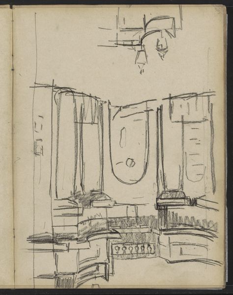 Curator: At the Rijksmuseum, we have a compelling, rather somber pen-and-ink sketch entitled "Grave and a Gravestone," by Carel Adolph Lion Cachet, dating from around 1897-98. What are your first impressions? Editor: Stark. Even unfinished, the image exudes finality. The sketchy lines barely contain the forms; it's all edges and angles. It lacks the comforting polish we expect, especially around memorials. It's rough. Curator: Cachet's sketchbook functions almost as a mnemonic device, a repository of potent imagery he would later revisit. This sketch represents more than just stone. Tombstones and burial sites across cultures are loaded symbols. In this case, the barely legible inscription hints at remembrance and a sense of loss. What narratives or cultural scripts do you perceive? Editor: It speaks to the cultural obsession with preserving memory, but it also underscores labor practices. The execution itself mirrors the physical toil inherent to stonemasonry. Raw strokes mimicking the craftsman's chisel. Look how he builds the grave not with grand strokes, but repeated tentative, and economical movements. Curator: You know, seeing it that way allows me to imagine the sketch being both an aesthetic observation of funerary architecture and a kind of symbolic performance related to social concerns and craftsmanship of that period. It's fascinating how the artist uses something so universally understood—mortality—to make something intensely personal. The inscription, while vague, evokes reflection. Editor: Precisely. By reducing the stone and its lettering to simple strokes, Cachet's focusing less on glorifying an individual or commemorating a single historical narrative, but on a system of symbolic gestures. A grave reminds us that mortality awaits, but tombstones? Tombstones imply wealth, memory, the control to define history itself. Curator: Cachet captures something very potent, doesn't he? This isn't merely an illustration, but a reflection on societal values. It underscores the profound intersection of grief, remembrance, labor, and legacy. Editor: I see this not as mere documentation, but social critique made visible in line. Thinking about materials brings out complex historical narratives of production and societal values that intersect unexpectedly.