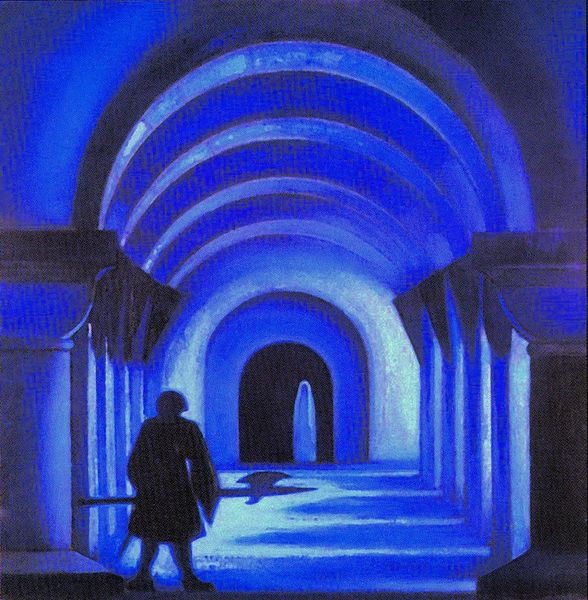 Curator: Look at the vibrant golden light inside that structure. There is something holy about the luminescence contrasting the otherwise dusky purples of this artwork. Editor: It certainly does evoke a specific feeling. Something like solemn contemplation… or perhaps a silent vigil? Who are we waiting for? It feels very Gothic. Curator: It does possess certain Gothic characteristics, though Roerich, who created this tempera piece, titled "Castle", in 1936, engaged with far more than simply the Gothic when producing it. The castle conjures ideas related to romance and spirituality simultaneously. It even presents a sense of longing and solitude. Editor: I agree that there's a pervasive sense of solitude, which, for me, speaks volumes. This feels very much of its time, the anxieties and the isolation many people felt leading up to the war. It captures that sense of uncertainty, the fragility of structures, both literal and societal. Curator: Absolutely. One might be keen to point to the architectural features—those repeated arches. Consider the repeating arches as portals, opportunities for transition, reflection, and introspection. Perhaps even echoing mantras. Editor: The arches also draw attention to the shadows and the void—the hidden parts. It could also reference specific anxieties related to public versus private space and historical preservation versus innovation at the time. Even national versus transnational identity… I mean, look at the architectural style. Curator: That small figure seated on the steps is quite striking, even as their form blends into the darkness; I see a potential symbol of resilience. What kind of role does he/she play, though? Are they watching, protecting, waiting? It could imply several different concepts... Editor: Precisely! And in what sociopolitical position does this solitary character sit? Consider the hierarchies embedded in architectural spaces like this, how access is often restricted, who is welcome, and who is relegated to the margins, symbolically or in practice. Curator: I am touched by the feeling of wonder and mystery it stirs in me, personally. I notice the way it combines reality and imagination into a transcendent and contemplative experience. Editor: For me, "Castle" serves as a powerful reminder of how art can act as both a mirror reflecting the concerns of its time and a window offering glimpses into the unknown, forcing us to examine the ideologies underpinning our society and individual positions within those frameworks.