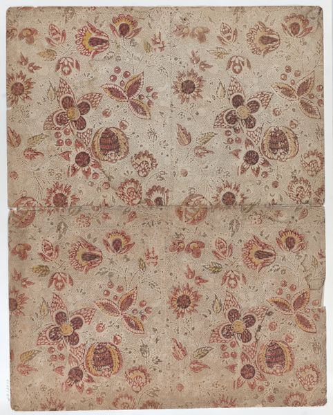 Editor: This is "Sheet with overall dot, floral, and vine pattern," dating from around 1800 to 1900. It's an anonymous piece at the Met, and it looks like it might be a textile design, maybe a drawing or print. There's a quaint, almost folk-arty feeling to the repeating patterns. What's your take on this piece? Curator: It immediately speaks to me about the often-dismissed contributions of women and marginalized communities in the decorative arts. Textile design, particularly during the 19th century, provided a creative outlet, and sometimes even economic independence. Do you see how the seemingly simple, repeating pattern could actually represent a coded language, a form of silent expression? Editor: A coded language? I hadn't considered that. The flowers and vines just seemed like typical decorative motifs. What would they be expressing? Curator: Think about the social constraints of the time. What were the limited avenues for women to voice their opinions or critique the dominant social order? These patterns could subtly incorporate symbols of resistance, hidden narratives about freedom, or commentaries on domestic life. Consider the "organic pattern" tag – does nature simply exist as an aesthetic flourish, or might it embody resilience in the face of oppression? Editor: So you're suggesting this isn't just pretty wallpaper? Curator: Exactly. The beauty is intentional, inviting us in, but we must then delve deeper into the possible narratives woven into the fabric, questioning the power structures that relegated these forms of expression to the domestic sphere, effectively silencing their political potential. Editor: That shifts my perspective completely. It makes you wonder about the artist’s intentions and lived experiences. Curator: Precisely. By acknowledging the social and historical contexts, we give agency back to the anonymous artist and appreciate the depth of her creative voice.