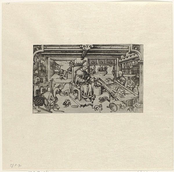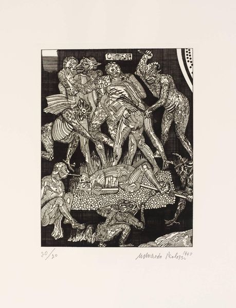Editor: This is an etching by Lovis Corinth titled "Gastmahl des Trimalchio 06." It feels like a scene plucked from a dream – or perhaps a nightmare. There’s a crowd of figures, mostly nude, surrounding what appears to be a large man in the water. It has a very stark feel. How do you interpret this work? Curator: Indeed. Corinth plunges us into a world thick with classical allusion, evoking Petronius’s *Satyricon* and its decadent feast. But what feast is this? It is unsettling, wouldn't you agree? The central figure is grotesque. Editor: Yes, it is, those large hands and that... vacant expression? Curator: They invite us to reflect. Look closely at those vacant eyes, are they a symbol for humanity's baser instincts and desires. Consider the figures surrounding him. Are they adoring or mocking? Their distorted bodies contribute to a sense of unease, almost as if glimpsed through a fever dream. It evokes themes of social commentary, the dark side of pleasure, and even the fragility of the human form itself. Editor: I didn't pick up on that fragility initially. I was too distracted by the apparent debauchery. Curator: The image also carries forward cultural memory of expressionism. These artists are always thinking of what is recorded and passed on. And what that cultural record implies, even when it feels disturbing. It offers insight into both the classical past and the anxieties of Corinth’s time, doesn't it? What do you take away from it now? Editor: Seeing how Corinth uses imagery of the past to comment on the present... that’s really powerful. The distortion serves to emphasize certain disturbing qualities about cultural continuity, and humanity itself. It certainly lingers in the mind.