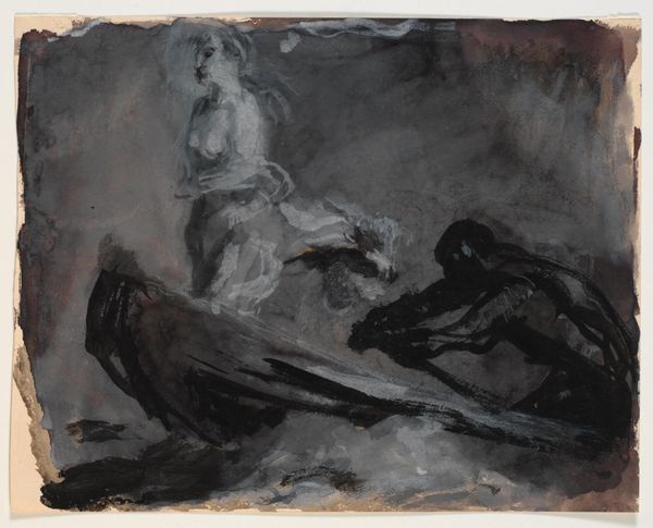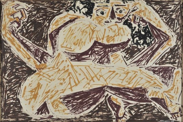 Editor: This is "Tod als Jongleur," or "Death as Juggler," created by Christian Rohlfs in 1935. The muted palette and rather frantic lines create a palpable sense of anxiety and unease, I find it so striking. What underlying stories do you see in this work? Curator: Immediately, I’m drawn to the historical context. Painted in 1935, on the precipice of the Second World War, this work speaks to the looming dread and the increasing awareness of mortality. Do you see how the "juggler," or Death, isn’t a triumphant figure, but almost emaciated and fragile? Editor: Yes, he seems skeletal. So you're saying that Death's fragility emphasizes the universal feeling of precarity at the time? Curator: Precisely. This links to Expressionism, Rohlfs's art movement, which visually externalizes inner turmoil. Consider, too, how the faces on the right, seemingly witnesses, express abject fear. It is not simply about death as a biological event, but as a pervasive cultural anxiety. What emotional weight do you feel emanates from the colour choices here? Editor: The use of pastels is interesting; such gentle colours, yet applied so forcefully... Is it ironic? Curator: Perhaps it is ironic, yes. Or perhaps it speaks to a resignation. Death isn't necessarily a dramatic event but an inevitability. The symbols resonate in the viewer’s psyche, stirring anxieties both personal and collective. It's a fascinating interplay, no? Editor: It is. I initially focused on the aesthetic anxiety but understanding the historical context and Rohlfs' artistic choices provides such a richer interpretation. Thank you! Curator: My pleasure. Seeing these artworks from an iconographic perspective helps us recognize how symbols persist and transform across time and culture, offering new ways to interpret history.
