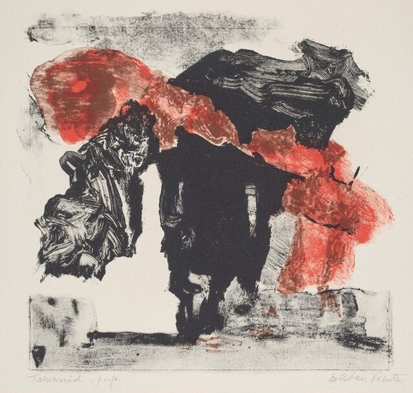 This print, *Untitled I*, was made by Esteban Vicente with lithography. Look at how the colors—red, gray, and black—are layered, almost like cut-outs pasted together. It's a process-oriented way of working, where each mark builds on the last. I love the rawness of this piece. The textures are immediate; you can almost feel the grain of the lithographic stone. Vicente isn't trying to hide the process. See the way the black ink is scratched and smudged at the upper right? It's like he's wrestling with the material, letting the ink have its say. That single dab of red within the black area has a real emotional punch too. It's this tiny interruption that highlights the interplay between these simple forms. Vicente reminds me a bit of Franz Kline, using bold gestures to create a sense of dynamic space. It's not about perfection, it's about the energy of the moment, and how we experience the world.