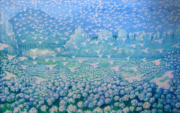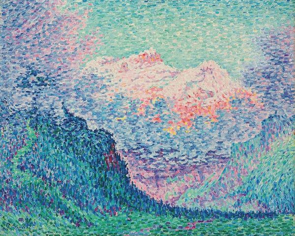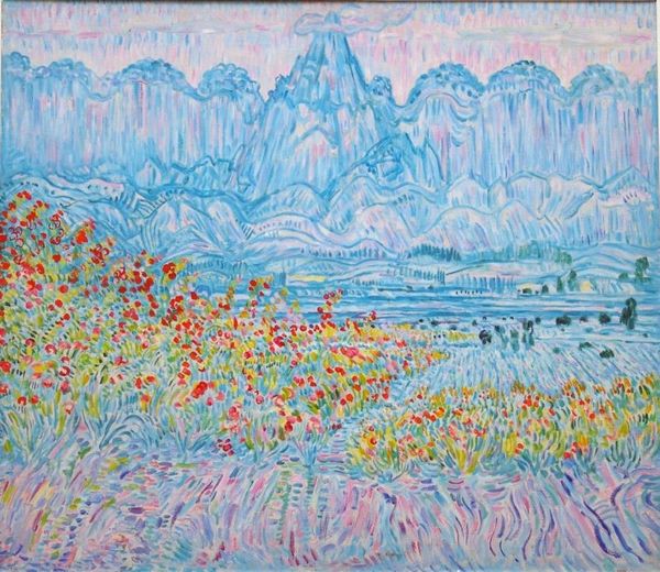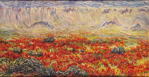 Curator: This vibrant canvas is "Nakhchivan Landscape" painted in 1968 by Sattar Bahlulzade, an Azerbaijani artist. What springs to mind for you when you see this painting? Editor: It’s so intensely chromatic. Like looking at the landscape through heatwaves, a dizzying shimmer. The trees appear as if they are dissolving. Curator: Indeed! Bahlulzade was celebrated for his bold use of colour and his expressionistic approach to landscape painting, moving towards abstraction, with Fauvist and Post-Impressionist undertones. The landscape, although deconstructed, holds potent symbolism, I think. Editor: Symbolism, you say? The palette here is evocative of Fauvism but that divisionist technique, those dabs of paint, seem directly drawn from Post-Impressionist ideas, don't they? Curator: It's about how colour constructs space, emotionally and psychologically. For the artist, nature and its inherent cultural value go hand-in-hand. He builds layers upon layers of symbolic associations within these colours. For example, the red ridges evoke feelings of passion and drama but are a memory of the earth and mountains so sacred to the Azerbaijani identity. Editor: That makes sense. It's a sort of visual encoding, right? The mountains themselves, regardless of the colour on display here, always signify stability and grounding. Bahlulzade captures this landscape from his memories. It's as if he has captured an ideal or a mythic place. Curator: Absolutely, it feels like he is not merely depicting a scene but also conjuring an emotion, layering cultural memory and connection into every stroke. He creates an emotional world which is not necessarily a replica, or attempt at a realistic, mirror image of our own. Editor: The density of the impasto amplifies the dreamlike quality, doesn't it? It moves far away from just seeing. It's visceral. One can almost feel the wind rustling. Curator: Looking at this artwork then feels almost like listening to the heart beating. What we think we know transforms. Editor: A landscape reimagined, or, should I say, re-felt, then? Curator: Perhaps felt for the very first time, even.