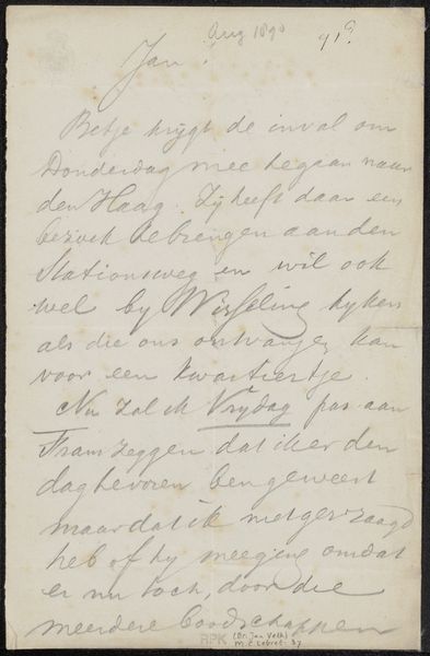 Curator: This is an intimate glimpse into the late 19th century: M.C. Lebret's "Brief aan Jan Veth," a drawing crafted between 1874 and 1894, using ink on paper. It's really just a simple letter. What does it evoke for you at first glance? Editor: A sense of delicacy, like holding a whispered secret. The handwriting, so carefully looping, reminds me of antique lace. I immediately zoom into a sense of hidden emotion. Is it me, or is the scale somehow a bit monumental? Curator: I wouldn't disagree at all! The scale invites such focus, drawing you into Lebret’s private correspondence with Veth. There’s a vulnerability here, don’t you think, sharing thoughts in this form? Think of the symbolism of letters as cultural artifacts. The script is both intimate and somehow very deliberate, hinting at the considered nature of written communication at the time, before instant messages of course. The use of pen and ink also gives it an old fashioned, official character... a historical seal of truth and authority. Editor: The writing looks stylized with the date marked at the very top...it's got to be important. Let’s consider it's value as an exchange between individuals rather than simply text on paper, I bet the reader also considered each symbolic loop or embellishment a statement of sorts. This very formal character gives the object weight. Letters can of course stand as tokens for social standing, like calling cards, objects invested with a power. Curator: Precisely. I find myself contemplating the very personal act of choosing a pen, dipping it in ink, and forming each word. In that choice, Lebret imbues the correspondence with more than just information; she’s sharing a part of herself. Perhaps she felt constrained by the format of a formal letter, where is the warmth that could have entered in the intimacy of the exchange with a friend in real life? Editor: It leaves one longing to decipher every nuanced flourish and hidden message contained within those loops and strokes. This humble drawing becomes an artifact that triggers broader ideas about intimacy, language, and cultural memory. What a delicious way to reveal the soul. Curator: Yes, and for me, it reflects the timeless power of personal correspondence and that craving for honest connection.