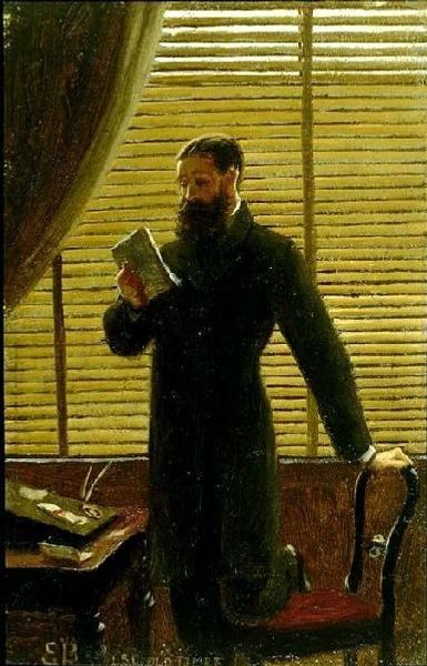 Editor: We're looking at Thomas Eakins' oil on canvas, "Portrait of Professor Benjamin H. Rand," from 1874. It feels very detailed and a bit cluttered, but the focus is definitely on the professor. I’m curious about how the artist’s decisions affect the viewing experience. What do you see in this piece, in terms of its structure and materiality? Curator: Immediately, I am drawn to the formal composition. Eakins has constructed a complex interplay of textures, from the reflective glass of the microscope on the left to the tactile fur of the cat and the patterned fabric draped on the right. Observe how the verticality of the microscope contrasts with the horizontal plane of the cluttered desk. The professor’s head aligns with the upper portion of the microscope, binding them together, whereas the cat pulls the eye toward the contrasting red sash draped nearby. Editor: So, the contrast in textures and forms creates a dynamic composition? The sash especially draws my eyes away from the Professor himself, actually. Curator: Precisely. And consider the semiotic significance of the microscope – it suggests the professor's intellectual pursuit, juxtaposed with the casual, almost intrusive, presence of the cat. Do you perceive how the muted color palette contributes to the somber mood? Editor: Yes, the darkness sort of concentrates the attention on the professor's face and hands, as they break up the dark background. And it is pretty somber, now that you mention it! I initially perceived it as detailed realism. Curator: The dark palette helps the gaze to linger on areas in a visually unified manner. Further note how the subtle use of chiaroscuro illuminates Professor Rand's features, highlighting his gaze and engagement with the document on his desk. The texture variations offer great rewards for close viewing. What's your take on that aspect? Editor: I appreciate your observation of these juxtapositions of textures, colours and structures; now I understand better how all these internal contrasts add to the effect and deepen my encounter with the work! Curator: Indeed! The artist's command of these formal elements transforms a portrait into a stimulating visual study of light, form, and meaning.