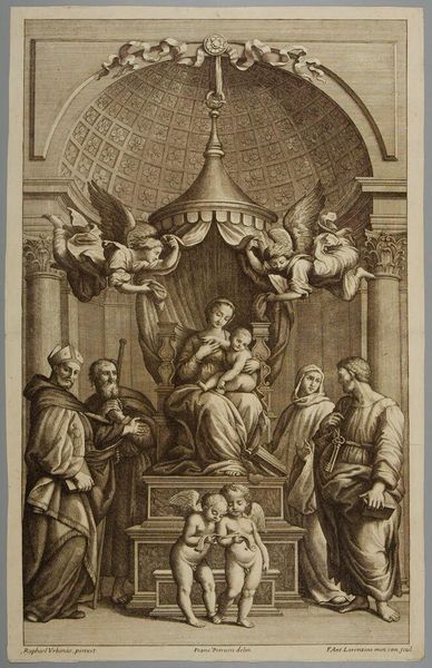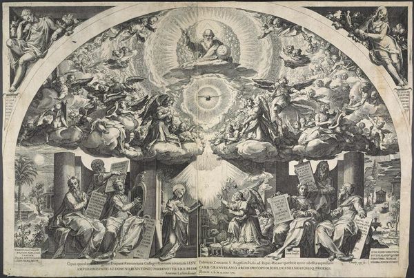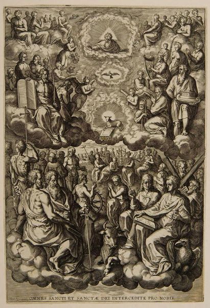 Curator: Immediately, I’m struck by the sheer density of detail. The tightly packed figures and ornate framing elements create a sort of visual cacophony. Editor: Indeed. Let’s delve into this print, “The Triumph of Christian Faith,” created by Jost Amman sometime between 1550 and 1591. The Met houses this piece; it’s a prime example of Northern Renaissance engraving and the symbolic weight of that period. Curator: Weight is right. The allegorical figures layered within that heavy oval—it almost feels oppressive. There's a hierarchy being meticulously enforced here, isn't there? The heavenly realm practically sits atop the human one. Editor: Precisely! Observe how the lower figures—seemingly representations of pagan deities—are dramatically cast down. The rising tiers feature scenes alluding to sacrifice, prophecy, and the virtues associated with Christian faith, building toward the image of Christ at the very top, backed by Hebrew script referencing God’s divine name. Curator: And that swirling, decorative border functions almost as a force field, visually separating this scene from the outside world. Do you see any attempt to create an integrated, natural space, or is everything staged to reinforce the intended religious message? Editor: Good point. The image abandons naturalism to become pure symbolism. Everything, from the postures of the figures to the light radiating from the dove representing the Holy Spirit, underscores the supremacy of Christian doctrine. The intaglio method further reinforces the image's gravity; each precisely etched line builds the scene into an impactful and imposing work. Curator: It’s less a representation, then, and more of a declaration. A strong assertion of Christian dominance, rendered with an almost intimidating degree of skill. There are remnants here, of course, of the transition into new religious norms. Editor: The triumph declared here really exemplifies that moment when Reformation and Renaissance culture shaped an emerging new cultural narrative, rendered through symbolic language so different from our own. Curator: A stark and revealing reminder of the visual rhetoric deployed during periods of monumental cultural transformation.