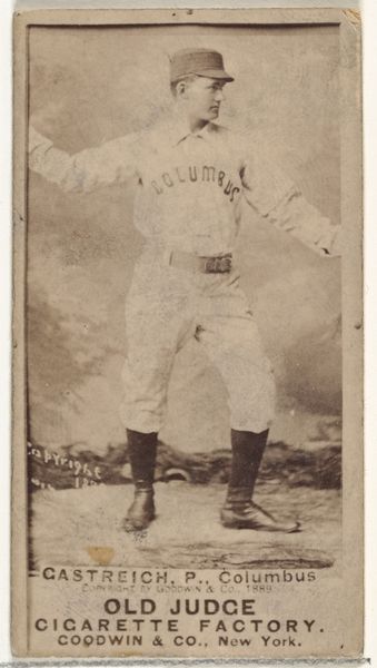 Curator: Here we have a piece from 1889, a photographic print produced by Goodwin & Company, part of the Old Judge Cigarettes series. It features Peter “Pete” Wood, a pitcher for Philadelphia. Editor: It's interesting to consider that an image like this would be tucked inside a cigarette pack. There's something quite intimate and, at the same time, commodified about that. My first impression is its sepia tone, its softness makes the athlete look posed, classical almost. Curator: Exactly. These cards served multiple purposes, primarily as advertisements but also as collectibles that spoke to the rising popularity of baseball. It highlights the symbiotic relationship between commercial enterprises and sports culture in the late 19th century. Think about the role that baseball played, in part, to knit together communities. Editor: It's difficult to ignore how class plays into this image and the history of baseball as well. Tobacco was consumed at the time across all social stratums, whereas, team sports had the purpose of bringing social classes together into community. But I wonder about the ethical implications. Using these figures, sports heroes, to advertise products linked to public health concerns like cigarettes. This intertwining is unsettling. Curator: Goodwin & Company brilliantly used celebrity endorsements ahead of its time to market their product. In many ways, the Old Judge series is an important archive showcasing popular culture, specifically baseball’s burgeoning influence in American life. Editor: And not without its problems. I would like to reflect more on the exploitative nature of early commercial photography and how this impacts labor issues then and in contemporary culture. Curator: It definitely opens up compelling discussions on image, industry, and ethics in the early days of American sports and mass consumerism. Editor: Indeed, seeing Pete Wood here throws a different light on themes about the complex connections between fame and commercial strategies and how those strategies impacted individual identity, even back in the late 19th Century.