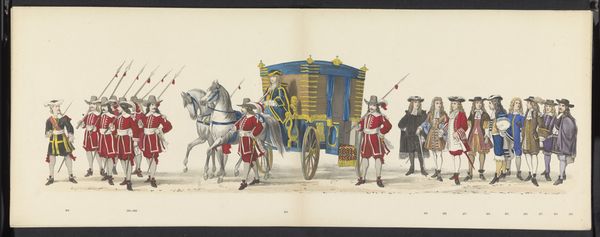Curator: The artwork before us is a watercolour illustration titled "Gekostumeerde optocht van 1841: wagen (blad XI)," or "Costumed parade of 1841: wagon (sheet XI)", created by an anonymous artist. It currently resides in the collection of the Rijksmuseum. Editor: The scene gives off a festive yet staged mood. It feels meticulously documented, capturing an idealized moment of pageantry with a certain self-conscious formality. What's striking is its muted palette and clear delineation between different components: horses with riders and the main wagon itself. Curator: Precisely. Note the artist's use of iconography. Each element feels carefully considered. We see not merely figures in costume but a curated display of historical symbolism through those garbs, colours and arrangement. Editor: Looking deeper, I wonder who this parade was meant to represent and celebrate. Was this meant as harmless festive practice, or was it more of a statement or cultural consolidation? How might power relations be enacted and challenged within that performance? The deliberate display invites scrutiny. Curator: It reflects an early-Romantic engagement with the past—a moment of Dutch national reimagining that found expressions in art, literature, and carefully constructed social rituals like these costume parades. The very act of recording this procession suggests its value as both a historical record and a symbolic representation of an idealized Dutch past. Note the use of colour as indicator. Editor: Yet, by visually isolating that parade within a vacuum, aren’t we, and wasn't the artist, also shielding the symbols it is meant to represent from questions? What ideologies underpin its imagery and are intentionally reproduced through them? What is romantic to one can be exclusionary to others. Curator: True. By immortalizing that ephemeral parade, the artist turned a moment into a enduring emblem, imbued with nostalgia and aspirations. Looking at those stylized details again and their careful rendering with watercolour brings us, I suppose, both aesthetic pleasure and symbolic understanding. Editor: Precisely, now the question would be—understanding what for whom? That, I would say, defines the artist's intent and political stance in recording that carefully displayed festivity.