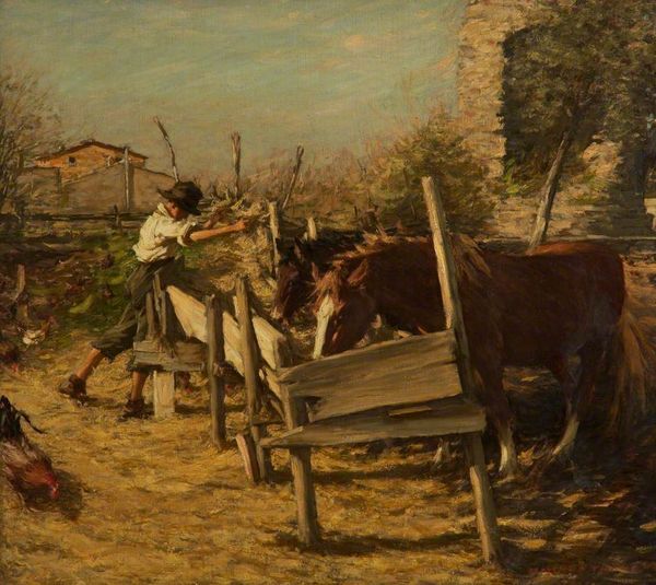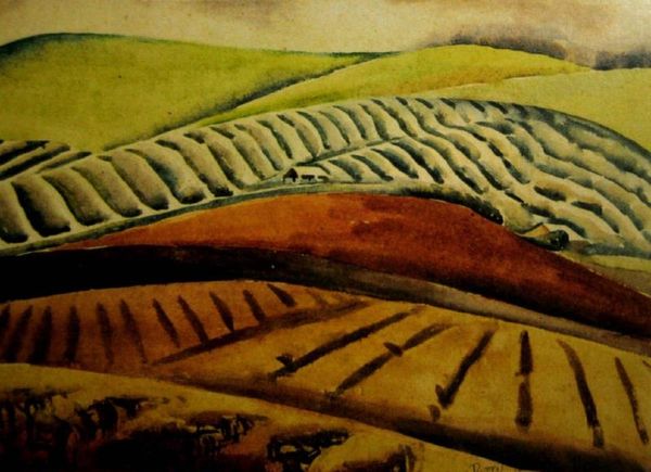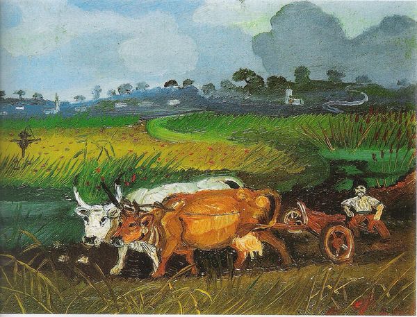 Henri Martin painted "Laborers Prepare the Vines in Quercy" using the pointillist technique, where small, distinct dots of color create an image through optical mixing. Notice how Martin structures the composition with the vineyard in the foreground leading to the cultivated fields and buildings in the background. This division of space, rendered in a tapestry of color, creates a sense of depth and order. The texture is built up with countless tiny brushstrokes. These marks not only define shapes but also construct light and shadow, giving the scene a vibrant, almost pulsating quality. The subject, laborers working the land, is framed by the semiotic system of rural life. This engages with broader artistic and philosophical concerns about man's relationship with nature, represented through the act of cultivation. The image's power resides in its ability to invite reflection, as these elements suggest harmony within a world shaped by labor and human intervention.