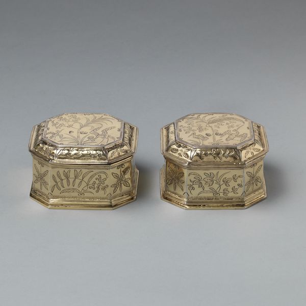 Curator: What immediately strikes me about this "Box" with accompanying candlesticks, dating roughly from 1685 to 1715, is the sheer volume of labor involved. Look at the tooling! Editor: I’m drawn to the almost muted quality of the metal, the way the light catches the details. I guess it’s part of a set by Nicolas Francois Foulon, created sometime between 1685 and 1715, but it almost feels contemporary. What do you make of it? Curator: Consider the Baroque period: this wasn't just decoration; it was a declaration of wealth and power. Each flourish speaks to the social dynamics and available resources. How long did it take a metalsmith to render these organic details, and what impact does this craftsmanship have? Is this "art" or "decorative object"? Perhaps these distinctions weren't as firm then as they are now. Editor: So you’re saying the artistry lies as much in the effort and material constraints as in the design itself? Curator: Precisely. Who commissioned it? Where did the materials originate? These details influence my interpretation. The candlesticks aren't merely functional objects; they reflect Foulon’s material resources, his level of training and shop equipment. The maker's hand is indelibly present here, and shouldn't be overlooked. Editor: I hadn’t thought about it in terms of labor costs, it gives the whole set new meaning. I appreciate how a Materialist lens broadens our understanding. Curator: Exactly! It's easy to admire craftsmanship, but really considering the means of its production encourages a more nuanced perspective. This isn't just something pretty to look at; it embodies the socio-economic dynamics of its time.