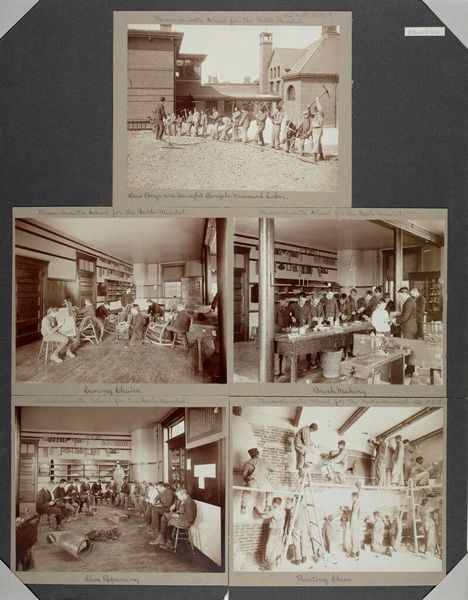 Curator: This photographic collage, credited to William A. Webster, is titled "Defectives, Feeble-minded: United States. Massachusetts. Waverly. School for Feeble-minded: Massachusetts School for the Feeble-Minded." The sepia tones give it a somber weight. Editor: It looks like a collection of industrious scenes— workshops, sewing rooms, even a band. The material conditions seem almost… hopeful, despite the title. Curator: The title is jarring, isn't it? It speaks volumes about the social attitudes of the time. Each image offers a glimpse into the lives and activities, perhaps the intended rehabilitation, of those deemed "feeble-minded." Editor: The workshops interest me. Look at the array of potential skills being taught – woodworking, sewing. Labor, here, is explicitly a tool for social engineering, a material means to an ideological end. Curator: Indeed. And the band too – music as a form of discipline and social cohesion. Consider the cultural implications of such institutions. What societal fears are reflected here? Editor: Absolutely. Examining the material culture and labor practices within this institution forces us to confront uncomfortable truths about social control and the construction of normalcy. It's a powerful visual document.