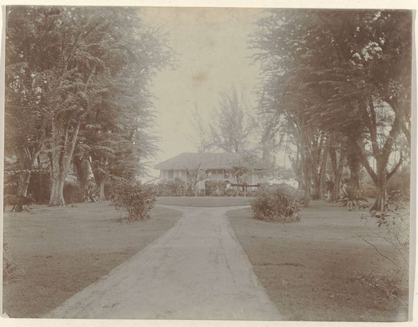 Curator: Ah, I am struck by the serenity, the stillness... almost like time is holding its breath in this photographic print. It exudes quiet contemplation. Editor: Indeed. This gelatin silver print, "Woonhuis met tuin," by Kassian Céphas, created around 1886, offers a fascinating study in composition. Note the clear lines of perspective directing our gaze towards the central structure, the house itself. The use of light and shadow also subtly segments the photographic space. Curator: That house though... doesn't it almost seem like a stage set? Those tiny figures posed on the porch…they’re so rigid. It makes you wonder about the realities obscured beneath that veneer of bourgeois order, doesn't it? Like everyone's playing dress-up. Editor: Certainly. One could interpret the structured garden and symmetrical façade as symbolic of social control. Note how the very subdued colour palette adds to this controlled atmosphere, suggesting, perhaps, the photographer’s subtle critique of colonial order in the Dutch East Indies. Curator: Mmm, or perhaps it's more melancholy, seeing the transience, capturing a moment. Photographs attempt to stop time, but here you really feel time eroding the original intent and mood. Editor: It could be argued, though, that photography intrinsically lends itself to freezing time, thus enabling posterity, yet the artistry lies precisely in layering emotional depth into its objective frame, transforming mundane realism into enduring symbolist metaphor. Curator: Alright. Alright. Now I'm wondering about the unseen inhabitants... their lives unfolding within those walls as a photographer points and snatches away a piece. And forever binds the souls inside with their new image! Editor: Indeed, it's those unspoken stories within and between spaces— between foreground and structure — that amplify and intensify the artistic value that makes a work memorable. Curator: Well put! I still sense that stillness I mentioned...it invites deeper reflections. It’s like Céphas froze more than just the scene... he’s immortalised an intangible, emotional state of mind. Editor: Precisely; that is exactly the synthesis that ensures the success of an artistic enterprise in whatever material or time: merging both intellect and feeling.