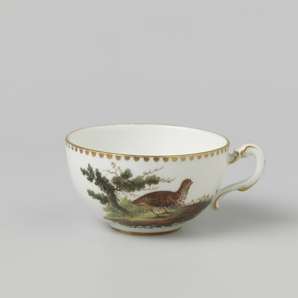 Curator: This painted porcelain cup, dating from around 1782-1784, was crafted in Loosdrecht. Its painted decoration features poultry in a landscape. What are your first impressions? Editor: It's incredibly delicate. The image is neatly organized as the eye follows a circle of life around it with the small and vivid fauna painted directly onto this almost weightless porcelain form. Curator: Indeed, these objects reflect the rising bourgeois taste of the period. Owning porcelain became increasingly accessible, with local manufacturers like Loosdrecht catering to the demand. Cups like this one demonstrate how art permeated daily life, embedding visual narratives within domestic rituals. Editor: I notice the artist uses very subtle color variations. The almost-monochromatic bird seems a deliberate choice, placing it directly on the bright, contrasting canvas of white. The painting captures this creature with the barest means and is very successful as such. It provides the entire scene's focal point in the visual field. Curator: Cups of this type also spoke to specific social functions: the rituals of tea and coffee drinking became central to social gatherings and household display. The imagery, therefore, served to signal the owner's refined taste and adherence to contemporary trends. What strikes me about this object is how utilitarianism blends into artwork so smoothly. Editor: Agreed! This blend of aesthetic and functionality is striking. The handle mirrors the curving forms within the painted landscape itself, suggesting a self-conscious formal unity. There's such grace here; the painter understood that less is more, capturing just enough to stimulate the eye. Curator: Thinking about the bigger picture here, pieces like this help us understand the nuances of material culture, trade, and national identity that all intertwined in this particular historical moment. This isn't just about art for art's sake, but about how society and power find themselves expressed through what we chose to live alongside. Editor: Right, and close study of elements such as line, form, and space enables a deeper appreciation for the artist’s decisions here. They weren't merely painting a bird on a cup but capturing a larger composition for a sensory and intellectual impact that remains even today.