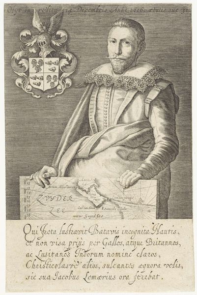 Curator: Here we have an engraving entitled "Portret van Thomas Cavendish" by Jodocus Hondius, created around 1595-1597. Editor: My first impression? A striking composition! The detail is astonishing, and the contrasting textures of his garment and the maps create a rich visual experience. Curator: Indeed. Hondius, known for his cartography, positions Cavendish, a famous English explorer, with globes depicting his circumnavigation. It's a calculated visual assertion of England's burgeoning maritime power. Editor: From a formal perspective, notice how the oval framing device is echoed in the circular globes. This reinforces the theme of global exploration and emphasizes Cavendish's connection to the world at large. Curator: And observe how the Latin inscription underscores Cavendish's noble status and accomplishments. It's a carefully crafted image designed to promote his legacy and, by extension, England's ambitions. The portrait, therefore, is not simply representational but actively participates in shaping Cavendish’s public persona. Editor: Yet, within this grand display of power, I see a more subtle, perhaps even vulnerable, quality in Cavendish's gaze. It suggests a certain introspection despite the confident pose and lavish clothing. There is such skill on the linear construction and hatching which produces remarkable tonal modeling in black and white Curator: Interesting observation! This ambiguity perhaps reflects the complex social and political context of Elizabethan England, where exploration was both a source of national pride and fraught with risk. The formal constraints of portraiture allowed for limited expressions of individuality or unease, I suppose. Editor: Precisely. It’s fascinating how Hondius balances the requirements of propaganda with subtle, almost subliminal cues of human complexity, creating an engraving with many layers of detail. The patterns work to great affect for texture. Curator: The work really epitomizes the intersection of art, power, and historical narrative in the late 16th century. Hondius delivered a multi-layered and deeply evocative artifact reflecting on Elizabethan aspirations for territorial control. Editor: Agreed. Hondius masterfully employs form to embody larger societal shifts. And the overall effect leaves you contemplating not just Cavendish himself but the very nature of exploration and representation.