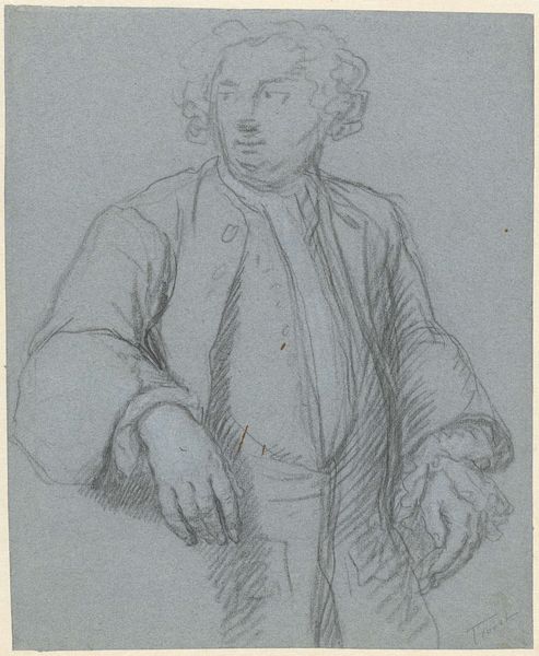 Petrus Johannes van Reysschoot created this portrait with sanguine chalk, giving the work a warm, textured feel. The loose hatching strokes build up the figure, emphasizing the contours of the man’s jacket and the soft curls of his wig. The composition focuses on the upper body, presenting a sense of immediacy and presence. Reysschoot’s drawing captures the essence of his subject through the interplay of light and shadow. The quick strokes suggest movement, breathing life into the portrait, while the texture of the chalk adds depth. The artist’s choice of sanguine chalk is not merely a practical one; it's a deliberate aesthetic decision. The reddish-brown hue enriches the work, lending warmth and vitality to the figure, subtly engaging with historical and intellectual concerns about portraiture and representation. The sketch, with its visible lines and unfinished quality, invites us to consider the process of art-making itself.