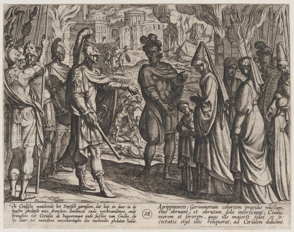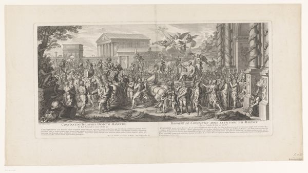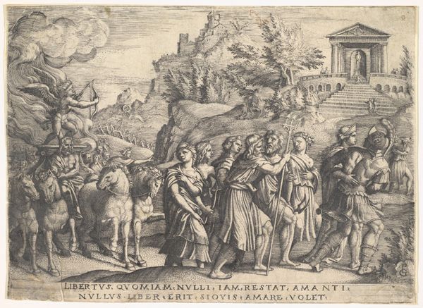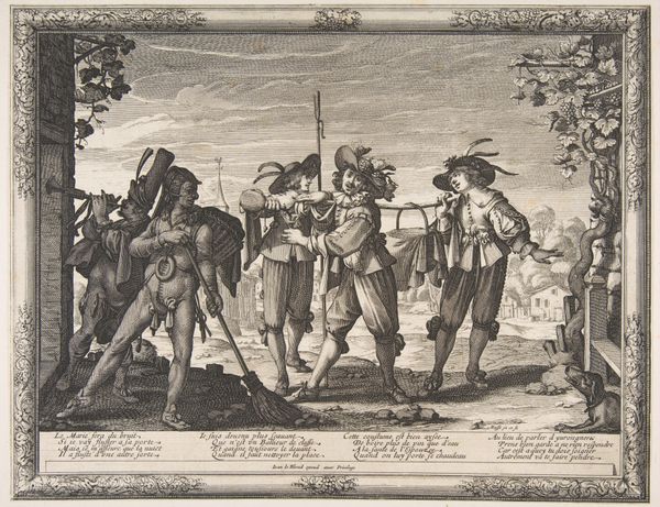 Editor: This is "Dance on the Village Square," an engraving by Abraham Bosse, created sometime between 1628 and 1638. It's fascinating how much detail he packs into such a small print! I'm really drawn to the rhythmic quality of the figures; they seem to be leading the eye across the composition. What aspects stand out to you? Curator: The masterful deployment of line, first and foremost. Note how Bosse uses varied line weight to create a sense of depth, moving the eye through the choreographed space. Consider, for instance, the dense hatching under the tree versus the delicate strokes that define the figures further back. How does that interplay of light and dark contribute to the overall structure? Editor: It seems like the framing of the image is creating depth, pulling you into the scene as you examine from front to back. Curator: Precisely. The decorative border establishes a contained pictorial space, a stage, if you will, upon which this social performance unfolds. The eye is then drawn into the foreground elements—the musicians, the gathering crowd—and guided toward the focal point: the dancing couple. The receding architecture creates a structured perspective. Editor: So, you're saying that the visual elements themselves—line, space, and composition—are what give the work its meaning, its structural depth? Curator: Absolutely. The essence resides not in historical interpretation but in the formal language employed. Each carefully placed mark contributes to a tightly organized, self-contained visual experience. Observe the artist's capacity to construct depth by utilizing linear reduction in conjunction with atmospheric reduction. What is your response to Bosse’s decision to use these strategies for optical enhancement? Editor: I think the line reduction really emphasizes how all the parts relate, while providing detail within those figures that would’ve otherwise gone unnoticed. That makes this an exciting print to dive into and examine! Curator: Indeed, a very astute observation about how formal components contribute to the whole.