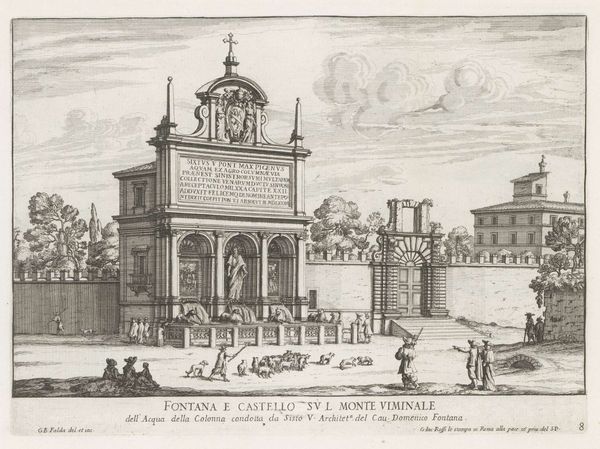 Curator: Let’s consider this captivating engraving from the Rijksmuseum's collection: "Fountain in the Cortile del Belvedere in the Vatican," dating back to between 1653 and 1691, by Giovanni Battista Falda. The composition pulls you right into the heart of the Vatican. What do you think, initially? Editor: Monumental! It almost feels staged. The perspective and sheer scale of the fountain against the building create this feeling of imposed grandeur. The precision in rendering all architectural detail gives the fountain a theatrical quality. Curator: Absolutely. Falda was a master at capturing architectural spaces, documenting Rome during the Baroque period. What's really important here is to view this work as documentation of power; it reveals not only aesthetic sensibilities, but also the values held by powerful institutions such as the Church at the time. This fountain was at the heart of papal power. Editor: Precisely, it invites analysis on the visual construction of power. The fountain isn't merely decorative. Its centrality within the Vatican complex suggests it acted as a focal point, visually enforcing and embodying the Vatican's influence. It would be fascinating to understand how people from different social strata perceived such displays of power. Curator: It is! The strategic placement within the Cortile emphasizes a sense of exclusivity. The courtyard itself was a carefully controlled space. How access was granted – or denied – communicated a great deal about status and belonging within this societal structure. Editor: Exactly. One must also ponder what such overwhelming artistic gestures signified to those marginalized, such as Rome’s impoverished and disenfranchised. It really emphasizes questions around whose history we are preserving when we celebrate such images. Curator: It prompts consideration of what aspects of history receive prominence within cultural memory institutions, and why certain architectural achievements become enduring symbols of cultural heritage, rather than looking at less triumphal stories. Editor: Definitely. Falda's work serves as a beautiful reminder of art’s connection with wider social structures, while challenging our perspective in what should be documented and revered. Curator: A stunning interplay between history, art, and enduring critical inquiry! Editor: Perfectly summarized, indeed. A space where politics and aesthetics elegantly coalesce to inspire modern critique.