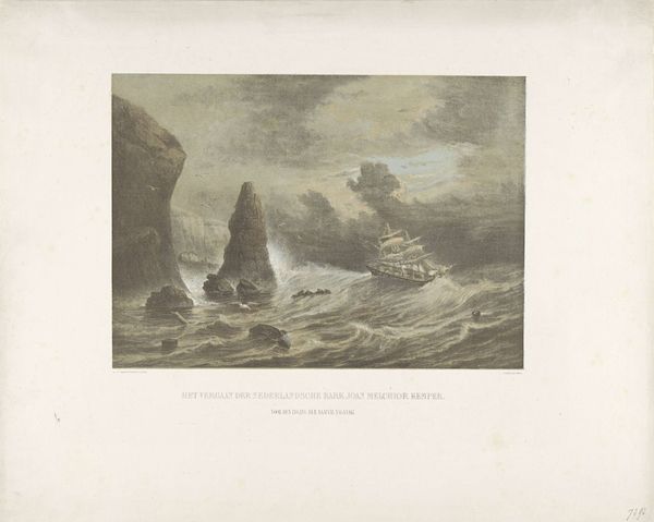 Editor: This is "Hunter in Rowboat Shooting at Seagulls," an engraving by François Grenier from sometime between 1831 and 1846. It’s a detailed image showing a small boat on choppy water, and there's a dramatic sky in the background. The light seems to catch the waves perfectly. I'm curious, what catches your eye first? Curator: Immediately, it's the sharp contrast in tonal values. Notice how the dark blues and greys of the sea and sky throw the highlights on the figures and the boat into sharp relief. Consider the artist's deployment of line; it’s incredibly precise, defining form and texture, especially in the rendering of the waves and the hunter's pose. Do you see how that tension created by that dynamic diagonal is a key structural component of the composition? Editor: I see it, it’s the direction of the hunter’s rifle. What does it mean? Curator: Precisely. The direction immediately leads our eyes to the seagulls which in turn, draws the viewer’s sight towards the upper corner. The texture, achieved through delicate engraving, lends a palpable sense of realism. Also consider the formal relation between this framed artwork within a larger empty picture plane: how does that resonate with the content for you? Editor: That’s an interesting idea, almost like the frame separates and isolates it from our world. So the engraving's focus isn't just on representing a scene but also on the interplay of light, shadow, and line? Curator: Precisely. Grenier, by his manipulation of visual language and deployment of technical ability in engraving is playing with a certain representation of our existence. Editor: That really helps me see it in a different light! It’s not just a picture of a hunting scene but an example of technique and arrangement to guide our reading. Curator: Indeed, you are starting to speak the language! This intense awareness of composition creates the possibility for new meanings.