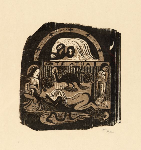 Curator: Gauguin's "Te Atua (The Gods) Small Plate," a woodcut from after 1895...what captures your eye in this print? Editor: It's certainly striking. I find the figures compelling, and the stark contrasts lend a dramatic feel. What does this woodcut tell us about the artist's practice, beyond the imagery itself? Curator: The very nature of a woodcut is critical. Think of the labor involved: the physical act of carving the image into the wood, the limitations and possibilities inherent in the material. How does the process of carving – the removal of material to create the image – inform your understanding of the figures depicted? Editor: It makes me think about the work's authenticity and how that might have changed from when he was carving these works to how we view these artworks now as viewers from the future. Like what material constraints he might have been facing? And who might be missing from the historical narrative because of these constraints? Curator: Excellent. Gauguin intentionally rejected the smooth finish of academic painting. He embraced the rough texture and graphic quality of the woodcut. This deliberate choice was tied to his rejection of Western industrialism and a desire to connect with what he perceived as a more authentic, primal artistic expression. Editor: That makes perfect sense. Is there a way to consider this as a commodity outside of it being just an art print? Curator: Yes. We have to also acknowledge how Gauguin consumed and transformed indigenous cultures for artistic purposes, participating in the colonial gaze. "Te Atua" can be seen as an artistic statement, and an early example of globalization through trading or commodity across regions. Editor: Wow, seeing it that way really enriches the experience. The impact of materials on his practice reveals new possibilities!