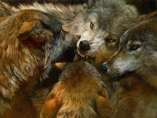 Editor: So this painting is called "Sheep in Wolf’s Clothing" by Don Ivan Punchatz. It appears to be an acrylic painting and the first thing I notice is the rather bizarre composition, with the wolf looming over the sheep. How do you interpret this work, looking at it from your perspective? Curator: Well, immediately I'm drawn to the material elements and production here. Look at the smooth blending of the acrylics; it suggests a mass-produced, almost commercial aesthetic. Considering Punchatz’s background as an illustrator, do you think this reflects the work's intention for wide consumption? Also, what about the contrast in textures - the wool versus the slick suit fabric? What does that suggest about the socio-economic layers at play? Editor: That's a fascinating angle. I hadn’t thought about the texture as a class signifier, but it makes sense. What do you mean about "consumption?" Curator: Well, we could ask what this represents about capitalist desires and anxieties. The wolf 'embraces' the sheep that appears harmless in its sartorial attire, ready to join capitalist society. Are they working together or is one consuming the other? How does this relate to the commercial world and the power dynamics it produces? Who profits from this strange encounter? Editor: That's a powerful reading! I hadn't considered how the materials themselves could be read as part of a commentary on those power dynamics. I appreciate you opening my eyes to thinking beyond the surface and into the means of production and what it means in terms of socioeconomic status. Curator: Exactly. By considering the materials, labor, and modes of distribution, we get closer to the work's social meaning.
