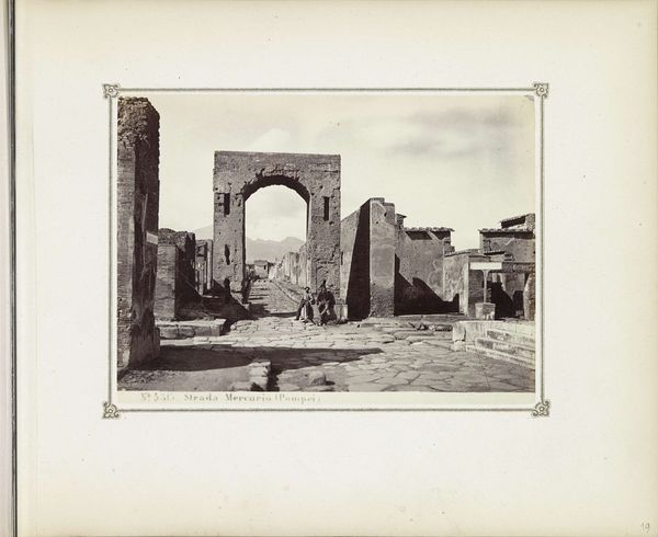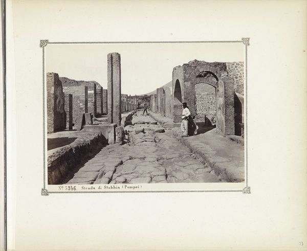Giorgio Sommer created this photograph of the Restanten van het Huis van Panza in Pompeï, printed on albumen paper. Dominating the foreground are the fragmented pillars of what was once a grand entrance, immediately drawing us into a study of decay and time. The photograph's composition hinges on these vertical structures, which frame a vista into the deeper spaces of the ruined house and, ultimately, to the distant Mount Vesuvius. Sommer masterfully uses light and shadow to articulate the textures of the aged stone, while the symmetrical arrangement of the pillars introduces a sense of classical order disrupted by ruin. The strategic framing and perspective serve to highlight the impermanence of human structures against the enduring backdrop of nature. The photograph isn’t merely a depiction of a historical site but a meditation on the dialectic between human ambition and natural forces.