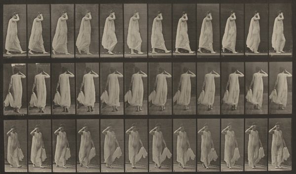 Curator: Immediately, it strikes me as a ghostly dance. These repeated figures...are they fading or emerging? Editor: I understand that impulse! What we are looking at is Eadweard Muybridge's "Plate Number 199. Curtesying, a fan in right hand" from 1887, a gelatin-silver print study of human locomotion. Curator: Locomotion. Such an understated title for what feels like a ballet of transience. A woman frozen, yet flowing. Look at the fan—almost vibrating with captured movement! Editor: Right! Each frame meticulously captures a stage of the curtsy, almost as if to deconstruct and examine the building blocks of a polite gesture, to strip off of its mystery. It almost reminds of medical study, something dehumanizing but deeply interesting. Curator: Yes, like examining the gears of a social mechanism! But to me, it evokes more than that. It touches upon the symbolism of ritual. The bow, the bend, it all suggests a dialogue with something greater, lost somewhere between intention and action. It all seems deeply coded with meaning! Editor: Fascinating perspective. And considering his other works studying people and animals in motion, do you see any ties there? Do the repeated human action link our idea of what animals feel like to ours? Curator: An interesting point! The cultural impulse to order, to analyze. To me, it represents something beyond mere taxonomy. The fan here is central to my analysis, as if its repetitive nature reveals a language beyond just utility! Is it only to provide air? Or to add mystique and hide expression? Is it perhaps the representation of the fleeting human essence? Editor: Well, there is only one way to find out. I guess it's time to start doing some curtseying in front of my bathroom mirror. But until then, this investigation of gesture has given me a lot to think about, especially what we carry when we perform. Curator: Absolutely, something so basic but at the same time full of nuances, mystery, history, and cultural expression, frozen and at our disposal. A lovely exploration, indeed.