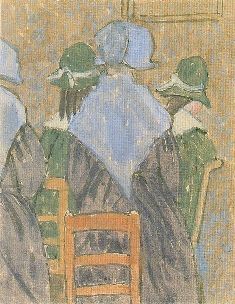 Gwen John created this watercolour painting, "Mère Poussepin and the Catholic Church," with delicate washes of colour and a gentle composition. The painting shows a scene of several women in an interior, presumably within a church setting. What strikes the eye is the interplay of colour and form. Notice the muted palette of browns, greens, and whites, which creates a serene atmosphere. The artist's use of translucent layers of watercolour gives the work a soft, almost ethereal quality. The figures, seen from behind, are simplified into geometric forms, their clothing and hats rendered with subtle variations in tone. John's formal approach invites us to consider the psychological dimension of the scene. The women, anonymous and absorbed in their devotion, represent a collective identity shaped by faith and tradition. The artwork's beauty resides in its quiet introspection. The structure invites ongoing interpretation and reflection.