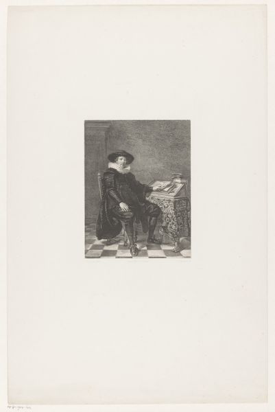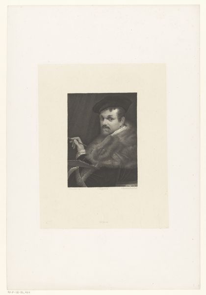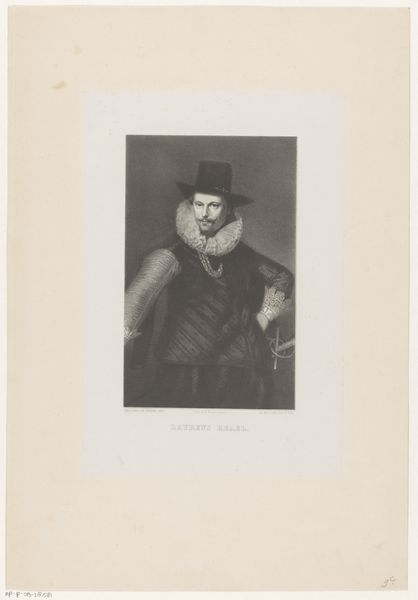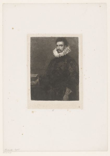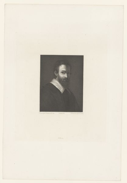 This is A. Rossena’s portrait of painter Lionello Spada. The print is dominated by tonal contrasts which suggest the sitter’s textured ruff collar, hair and hat, and soft skin. The composition is structured by the contrast between the sitter's dark attire and the stark white ruff. This juxtaposition creates a visual tension, drawing the viewer's eye to the face. The artist uses line and shading to define the volumes of Spada’s face, capturing a sense of depth and presence. Note the grid-like pattern in the background, which asserts the image's constructed, representational nature. The interplay of light and shadow, coupled with the textures, adds complexity to this portrayal. The portrait challenges the notion of a static, fixed identity, instead presenting a play of surfaces and depths that invite ongoing interpretation.