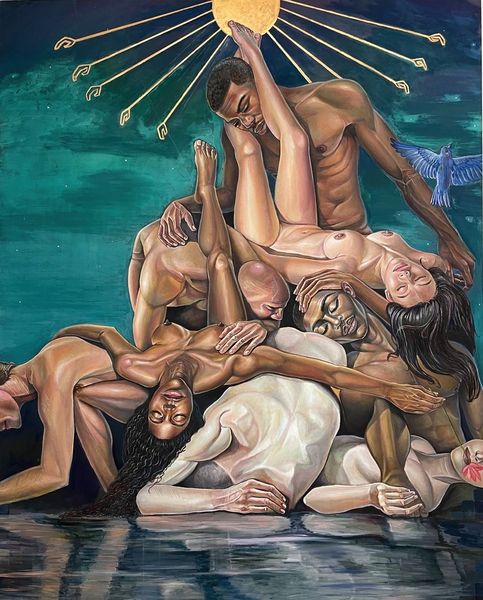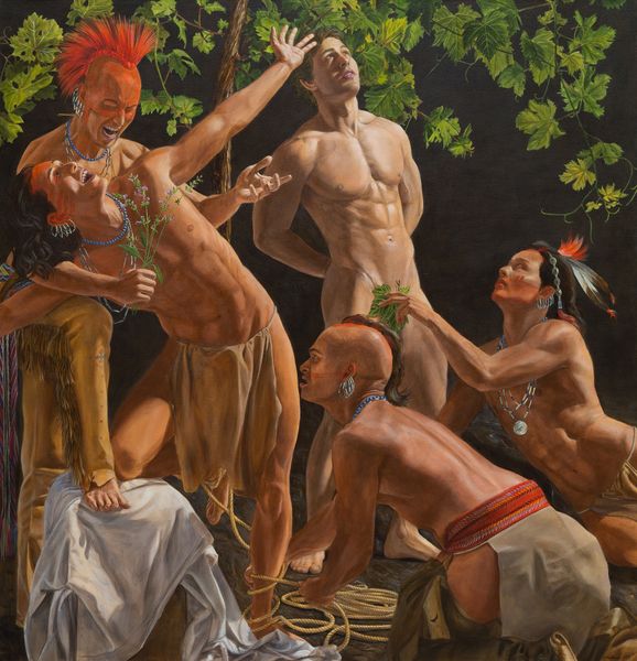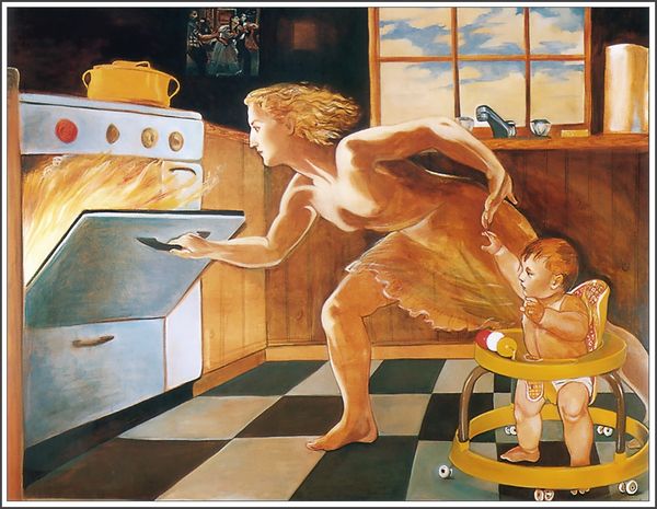Erik Thor Sandberg's painting, The Way of Things, presents us with a disquieting scene rendered in meticulous detail. The smooth, almost porcelain-like skin of the figures contrasts starkly with the violent act depicted. The composition is structured around a bizarre ritual: an old man attempts to cut off his beard while two children assault dead squirrels, all set against an idyllic garden backdrop. This juxtaposition creates a sense of unease, challenging conventional notions of beauty and innocence. The artist uses a clear, precise line and a muted palette, reminiscent of early Renaissance painting, yet the subject matter subverts this classical aesthetic. Sandberg destabilizes the traditional symbols of pastoral harmony, and his work prompts us to question the underlying structures of meaning that shape our understanding of art and culture. The painting unsettles us and leaves us pondering the darker undercurrents of human existence.