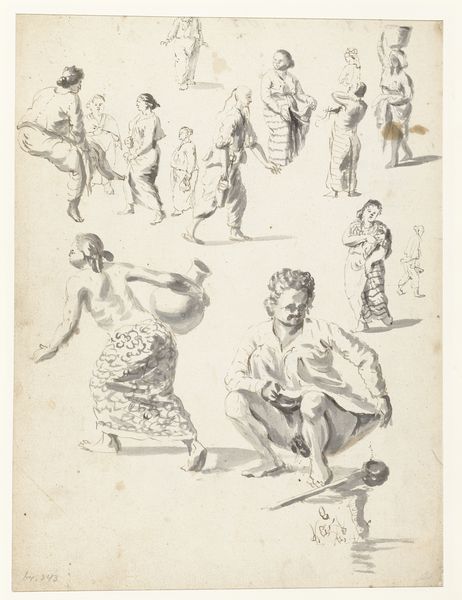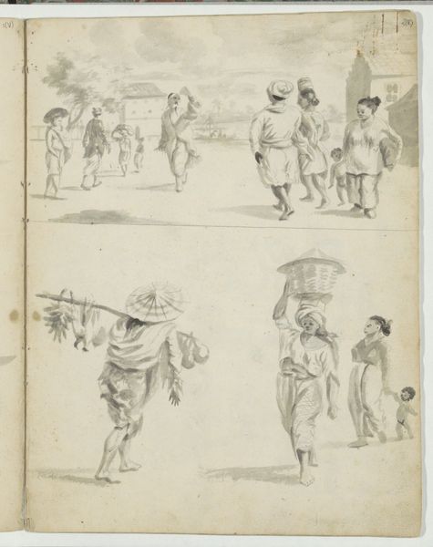 Wouter Schouten created this small drawing, "Figures of women in daily activities," probably in the late 17th century, using graphite on paper. The composition is divided into two registers with each depicting women engaged in various activities. Schouten uses line economy to capture the essence of each figure. The women's clothing is articulated with subtle shading to give form and volume. Schouten’s organization in the image creates a sense of rhythm. The repetition of forms and gestures, like the conical hats and carrying poles, leads the eye across the surface. The linear quality emphasizes the flatness of the picture plane, while the detailed rendering adds depth and realism. The drawing offers a glimpse into the daily lives of women in what appears to be a colonial setting, framed through the formal vocabulary of 17th-century Dutch art. The drawing prompts us to consider how the formal elements of art intersect with cultural representation and the social dynamics inherent in artistic production.