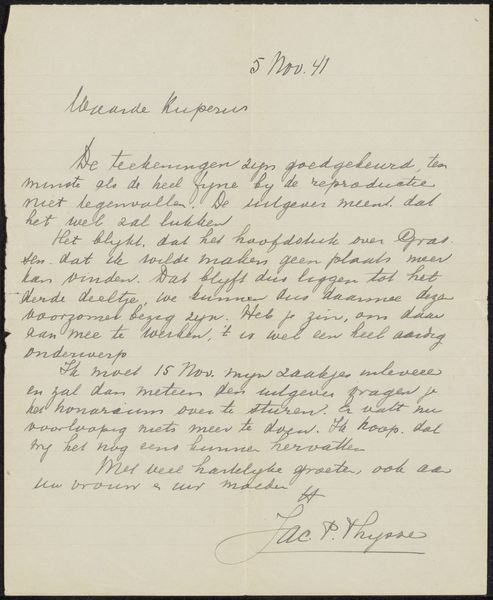 Editor: Here we have "Brief aan Jan Veth" by August Allebé, dating probably between 1907 and 1921. It’s a pen and ink drawing on paper, held at the Rijksmuseum. The overall impression is of intimacy, as though peering over the shoulder of someone writing. What strikes you about the composition and how do you interpret the hand lettering? Curator: What immediately seizes my attention is the interplay between legibility and abstraction. While ostensibly a letter, the function of conveying semantic meaning is secondary to the visual experience. Consider the density of the lines, their varied thicknesses, the rhythmic quality they establish. It's an exercise in pure form. Do you perceive any areas where the letterforms verge on becoming purely gestural marks, divorced from their linguistic purpose? Editor: Yes, especially toward the bottom where the signature becomes more of a flourish. The words become less distinct, more about the rhythm and movement of the hand. Is the artist experimenting with deconstructing language itself? Curator: Precisely. The drawing privileges the aesthetic properties of writing over its communicative function. The very act of writing transforms into a subject of artistic exploration. How does that change your understanding of the "letter"? Editor: It’s like the idea of a letter is present, but it's the shapes and textures, not necessarily the content, that are really important. More about the ‘idea’ of communicating? Curator: A key point, and quite an innovative idea for that period. In formalist terms, the artist’s intention, biographical details even, pale in comparison to what we derive through focused observation and analysis of shape and tone. A lesson indeed. Editor: Thank you, I can now clearly see that approaching this as an exercise in shapes allows a much clearer perspective than its actual contents.
