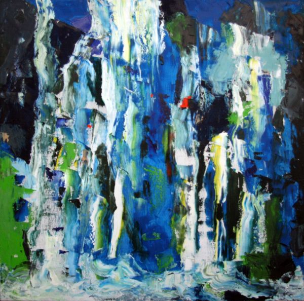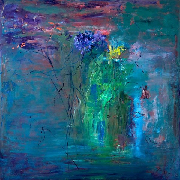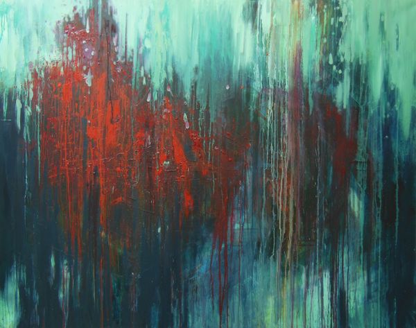 Nemanja Vučković created "Torrent," a 150 by 190 cm painting, using a mix of blues, greens, and yellows in what looks like a very active, physical process. The way the paint runs and drips suggests a real engagement with the materials, a kind of back-and-forth between control and chance. There’s a section near the top where yellow paint is splattered, almost like fireworks, and those little bursts of color really lift the whole piece. The texture seems key. I'm wondering what kind of brushes or tools were used here? It reminds me a bit of Joan Mitchell, especially in the way the colors blend and collide, but Vučković brings his own energy to it. Art's like a big conversation, right? Everyone riffing off each other, but always with their own spin. It's this constant push and pull that makes it so alive.