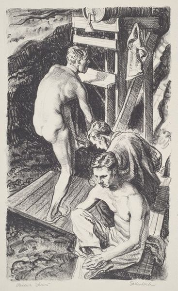 Editor: We're looking at "Mirror," an ink print by Max Weber, likely created sometime between 1928 and 1957. The nude figures seem very classically rendered, yet the composition has a modernist edginess. How do you interpret this work? Curator: I see a fascinating intersection of classical themes and modernist aesthetics, but more importantly, a reflection on the female gaze and self-perception. Considering Weber's social consciousness, particularly regarding immigration and labor rights, I wonder if this "Mirror" serves as a commentary on women's roles and representations in a rapidly changing society. Editor: That's interesting! The figures in the back seem almost voyeuristic, peeking in. Curator: Precisely. Their gaze introduces an element of power dynamics. Are they judging, admiring, or simply observing? And whose gaze matters most here: the viewer's, the figures', or the woman looking in the mirror? These are fundamental questions about gender and representation, echoing throughout art history and contemporary society. Editor: So, beyond the formal qualities of the work, you see it engaging with these bigger societal questions? Curator: Absolutely. Weber, influenced by both European modernism and his Jewish faith, invites us to consider the social and cultural context shaping the artistic expression. It makes us wonder, what societal “mirror” is Weber holding up for us to examine? Editor: I never would have considered these elements. I was initially stuck on its formal appearance and somewhat unsettled mood. Curator: That unsettled feeling might just be Weber’s invitation to engage with complex themes and recognize the social critiques embedded in the art. Editor: I see this print in a completely new way now, understanding its layered meanings about how women are perceived, and perceive themselves, in society. Curator: Precisely! And it showcases how art can challenge conventional perspectives on gender, power, and identity even when depicting seemingly simple subjects.