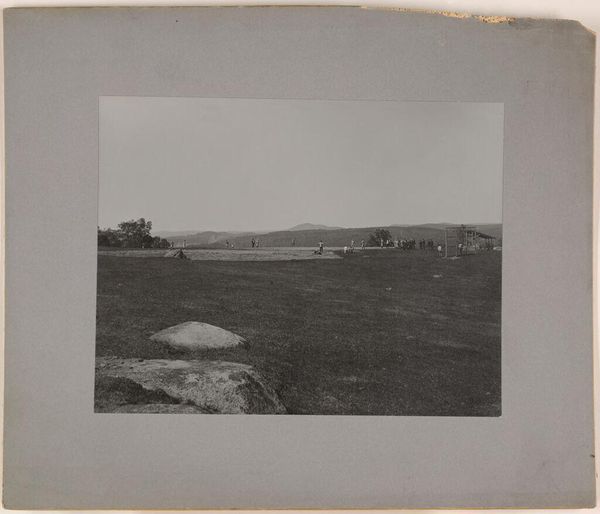 Curator: Let's consider Robert Frank's print, "Church--Wyoming," from 1956. What are your initial thoughts? Editor: Bleak, and perhaps intentionally so. The stark contrast, the remote location...it evokes a profound sense of isolation, wouldn't you agree? Curator: The composition certainly contributes to that feeling. Notice how the church is positioned on the horizon, almost dwarfed by the landscape. The deep blacks really dominate. Frank uses that high contrast, playing with the limited tonal range in a masterful way, flattening the pictorial space and drawing attention to the grainy texture of the print itself. Editor: Absolutely. And what does that framing say about the role of the church, and religion, in 1950s America, particularly in a state like Wyoming? Was it providing solace, or was it also somewhat marginal, perched on the edge of things? I see the church sharing space on a hill with what looks to be an outhouse or similarly plain storage shed... What a statement about land, class and religious practice. Curator: You make a good point. However, considering formal choices, I'd add that this positioning creates a visual tension, almost a sense of unease. There is nothing balanced or stable about Frank's composition. The tilted perspective disrupts any sense of harmony, and this is heightened by the heavy, dark foreground leading up the hill. It almost seems inhospitable. Editor: And I'd argue that inhospitality reflects broader social tensions. This image appears within Frank's larger project, The Americans, and he was actively documenting the disparities he observed across the nation. It speaks volumes about power dynamics, race, and the unfulfilled promises of the American Dream in the post-war years. This isn’t merely a picture of a church; it’s a statement. Curator: Agreed. It transcends a mere landscape. Editor: Precisely. Looking at it, I'm left contemplating what it really meant to build and sustain a community, and what structures held real value to these folks eking out a living on this hard land. What could be saved and what must be left behind. Curator: It's clear that through his technical skill and raw perspective, Frank challenges us to reconsider the familiar and probe deeper into the undercurrents of American life.