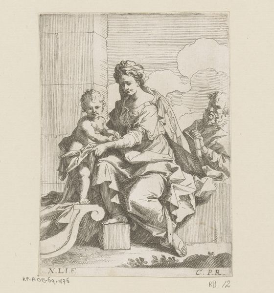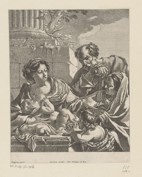 Nicolas Pierre Loir created this etching, “Maria met Kind, Johannes en Elisabeth,” where Mary sits regally, holding the infant Jesus, with Saint Elisabeth standing behind them and a young John the Baptist playing at their feet. Consider the column behind them—a fragment suggesting classical antiquity, yet repurposed to support a Christian narrative. Columns, ancient symbols of strength and stability, have long been associated with power and divinity, reappearing in varied forms across cultures, from the pillars of Egyptian temples to the triumphal arches of Rome. This visual adaptation reveals a fascinating cultural process: antiquity is being invoked and subtly reshaped to legitimize new ideological structures. Notice, too, the cross laying discarded on the ground. This foreshadows the future sacrifice of Christ, a symbol laden with grief and redemption. Such symbolic inversions resonate deeply within our collective psyche, evoking profound emotional responses tied to sacrifice, memory, and the cyclical nature of history. These resurfacing symbols are a testament to the enduring power of images.