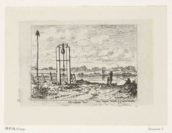 Curator: We’re looking now at Willem Linnig the Younger’s etching, "Kerkhof van Oberweimar," likely created between 1852 and 1890. It resides here at the Rijksmuseum. Editor: Ah, it gives me such a quiet, almost mournful feeling. The landscape looks haunted but not frightening, just... gently melancholic. Is that intentional, do you think? Curator: I think the somber tone stems directly from the site itself. The print showcases the architecture of a cemetery, foregrounding decayed statues and fragmented headstones. Editor: I see it now, those pillars rising out of what feels like organized ruin. Did Linnig render this directly, or would he have based it on some preliminary pencil work? It almost has a sketchbook feel to it. Curator: I would expect that the artist was drawn to this setting and had captured preliminary work as we can see some hints of his other works. What interests me is how Linnig engages with the material qualities of the etching process itself, how he manages to translate such palpable textures using these techniques. Notice how the line work contributes to a strong contrast? Editor: The shadows are beautiful. The buildings are faded back there near the clouds, I get this palpable sense of air and weather. Was there some cultural interest in cemeteries as places in themselves at the time, like tourism almost? Curator: Certainly. It coincided with Romanticism's fascination with ruins and nature reclaiming spaces touched by humanity. Graveyards provided very loaded scenes for contemplating time and the inevitable fate of all. Linnig likely was drawing also on realist themes from social settings during the era of its making. Editor: So, less about pure mourning and more a way to grapple with mortality through the lens of these public, semi-natural spaces. A way to be reflective through artistry and its labor in that time? I am taken back with how somber it felt on the first pass, seeing it this way changed my viewpoint. Curator: Absolutely, seeing Linnig engage here and what can be offered through print truly emphasizes the value and means to his social position and artistic capability. Editor: I will forever have to stop presuming an artwork based on its style, technique, or period of creation. Instead, appreciate how its position truly engages you on a personal level.